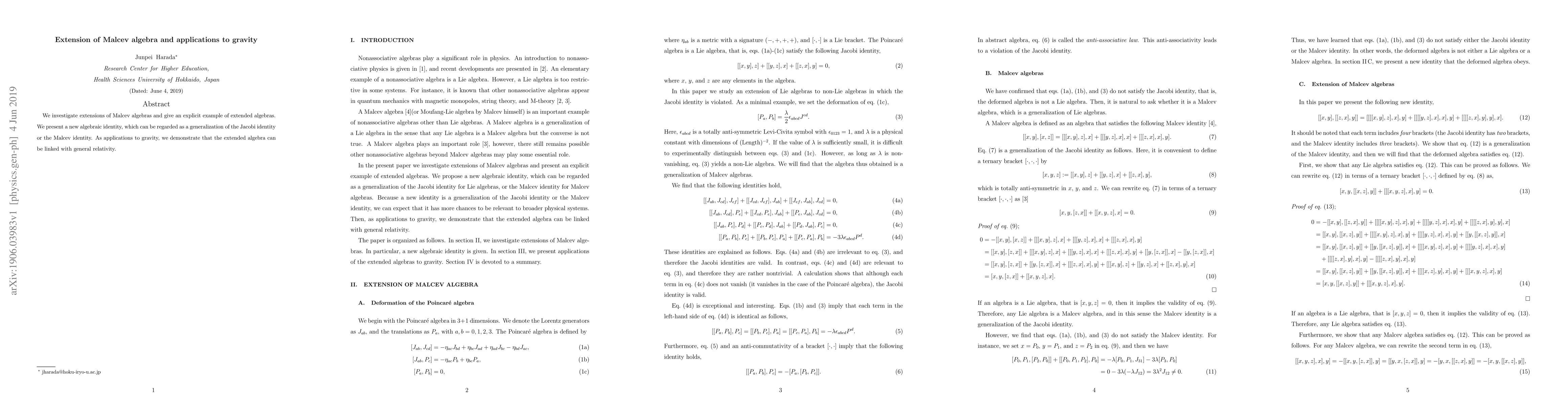 We investigate extensions of Malcev algebras and give an explicit example of extended algebras. We present a new algebraic identity, which can be regarded as a generalization of the Jacobi identity or the Malcev identity. As applications to gravity, we demonstrate that the extended algebra can be linked with general relativity.