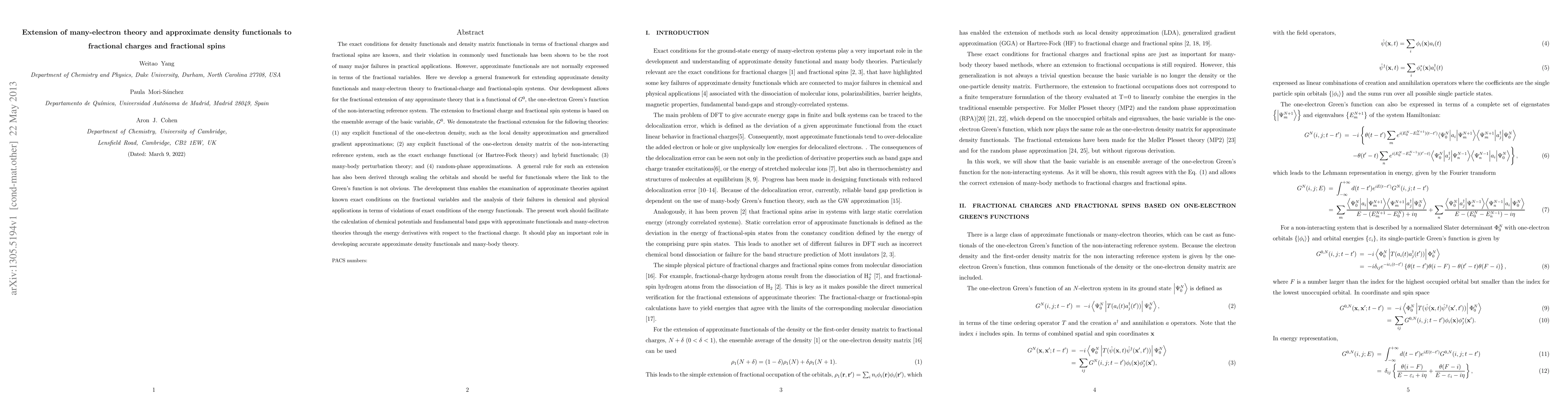This paper develops a framework for extending approximate density functionals and many-electron theory to fractional-charge and fractional-spin systems, enabling the examination of these theories against known exact conditions and facilitating the calculation of chemical potentials and band gaps. The approach is demonstrated for various functionals and perturbation theories.