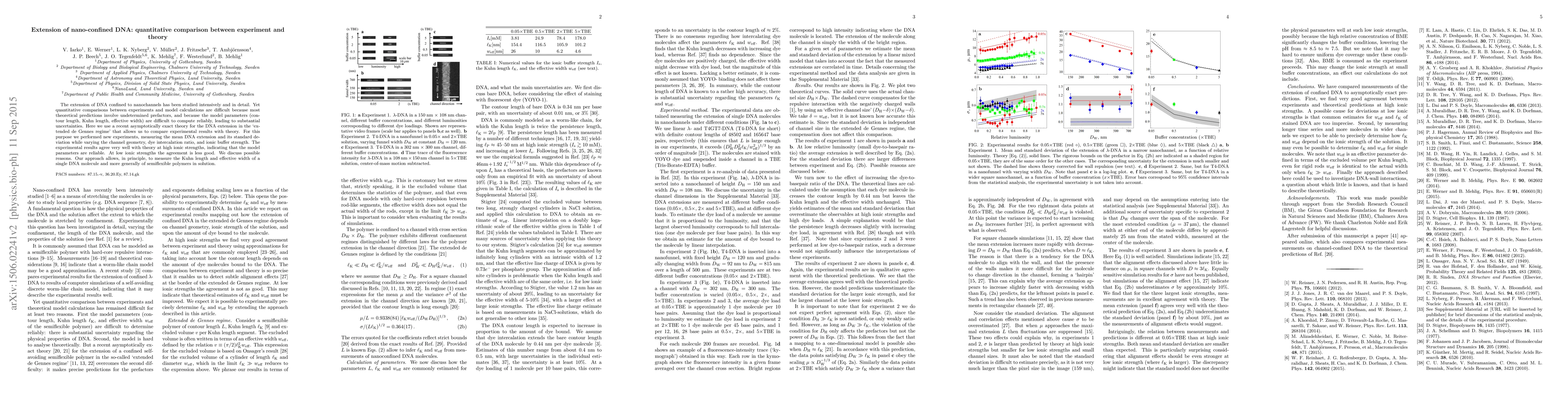 The extension of DNA confined to nanochannels has been studied intensively and in detail. Yet quantitative comparisons between experiments and model calculations are difficult because most theoretical predictions involve undetermined prefactors, and because the model parameters (contour length, Kuhn length, effective width) are difficult to compute reliably, leading to substantial uncertainties. Here we use a recent asymptotically exact theory for the DNA extension in the "extended de Gennes regime" that allows us to compare experimental results with theory. For this purpose we performed new experiments, measuring the mean DNA extension and its standard deviation while varying the channel geometry, dye intercalation ratio, and ionic buffer strength. The experimental results agree very well with theory at high ionic strengths, indicating that the model parameters are reliable. At low ionic strengths the agreement is less good. We discuss possible reasons. Our approach allows, in principle, to measure the Kuhn length and effective width of a single DNA molecule and more generally of semiflexible polymers in solution.