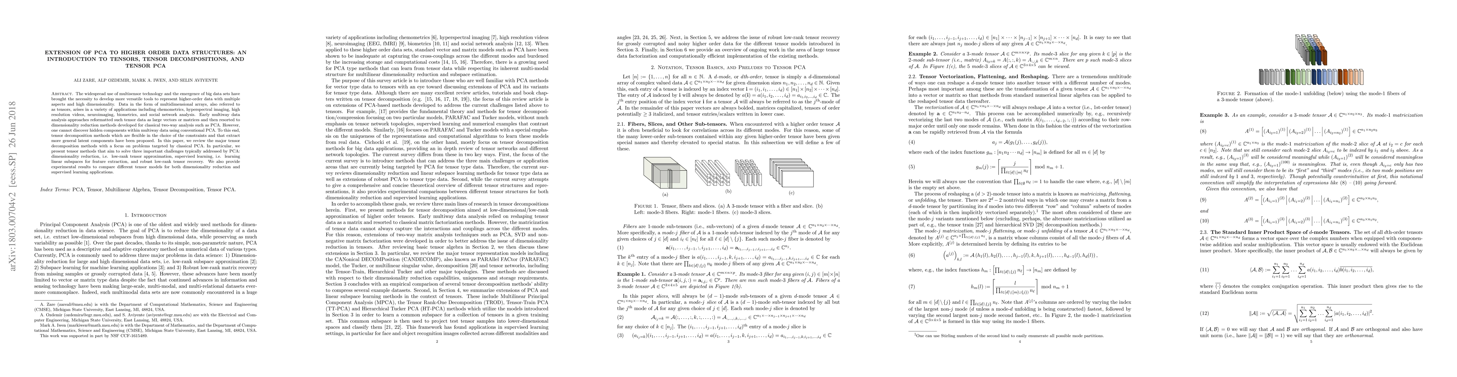 This paper introduces tensor decomposition methods for higher-order data structures, reviewing techniques that extend PCA to tensors. It focuses on tensor PCA for dimensionality reduction, supervised learning, and robust low-rank tensor recovery, providing experimental comparisons of various tensor models.