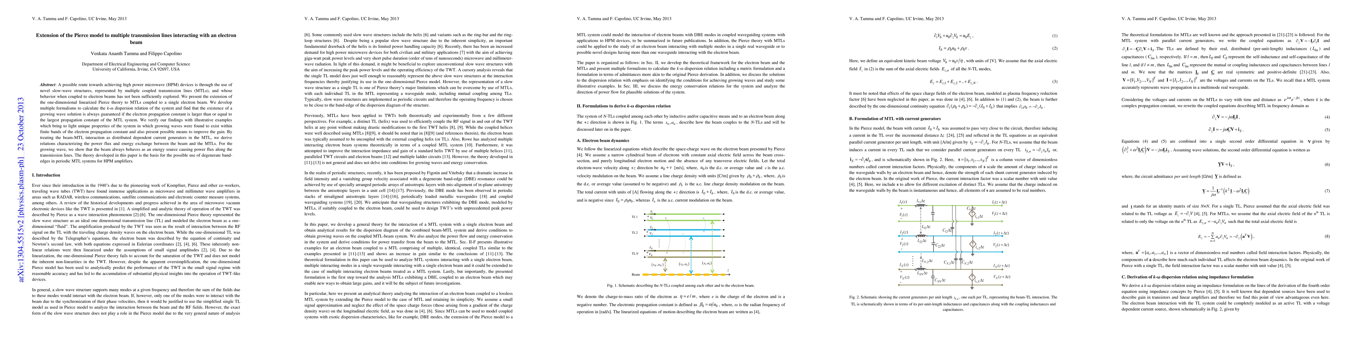 This paper extends the Pierce model to analyze multiple coupled transmission lines (MTLs) interacting with an electron beam, developing formalisms to determine the k-{\omega} dispersion relation and showing that growing wave solutions exist under certain conditions. The study reveals unique properties and potential means to enhance gain, laying the groundwork for HPM amplifier applications.