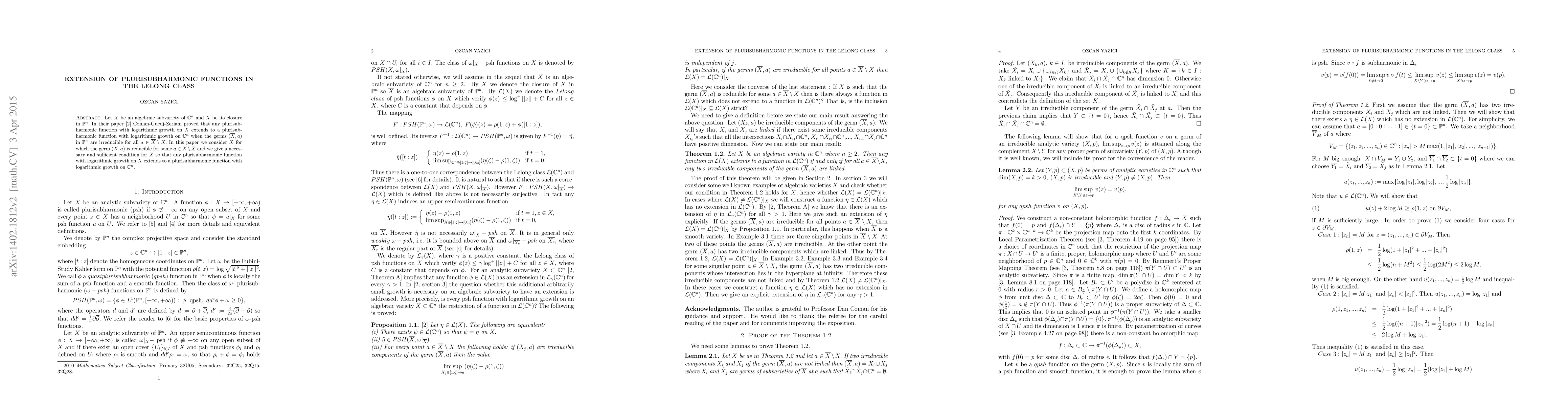 Let $X$ be an algebraic subvariety of $\mathbb C^n$ and $\bar X$ be its closure in $\mathbb P^n.$ In their paper \cite{CGZ} Coman-Guedj-Zeriahi proved that any plurisubharmonic function with logarithmic growth on $X$ extends to a plurisubharmonic function with logarithmic growth on $\mathbb C^n$ when the germs $(\bar X,a)$ in $\mathbb P^n$ are irreducible for all $a\in \bar X\setminus X.$ In this paper we consider $X$ for which the germ $(\bar X,a)$ is reducible for some $a\in \bar X\setminus X$ and we give a necessary and sufficient condition for $X$ so that any plurisubharmonic function with logarithmic growth on $X$ extends to a plurisubharmonic function with logarithmic growth on $\mathbb C^n.$