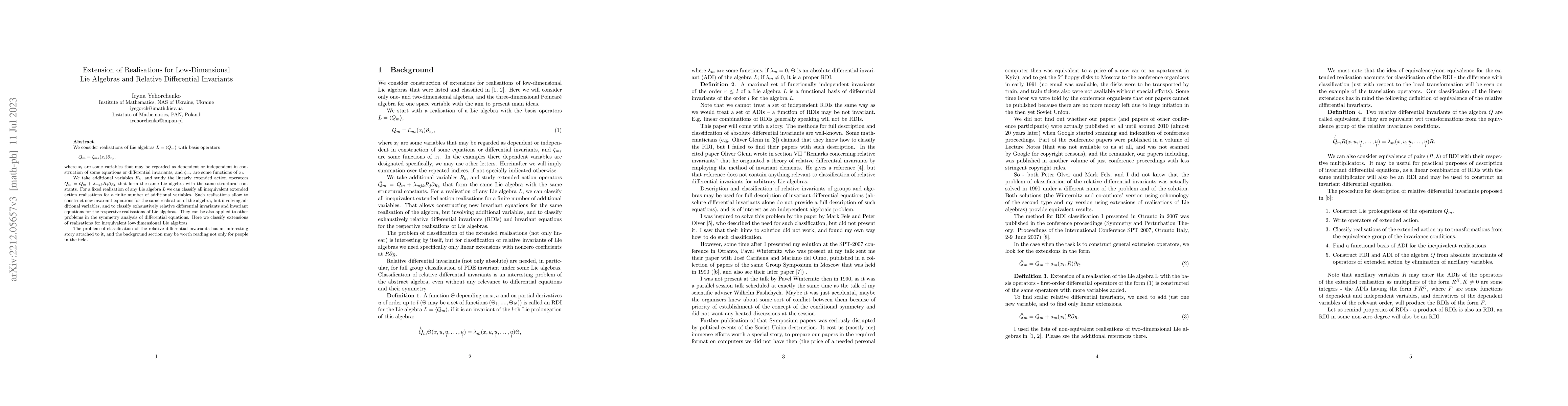 This paper explores the extension of realisations for low-dimensional Lie algebras by introducing additional variables and classifying all inequivalent extended action realisations. It provides a method to construct new invariant equations and exhaustively classifies relative differential invariants for these extended realisations.