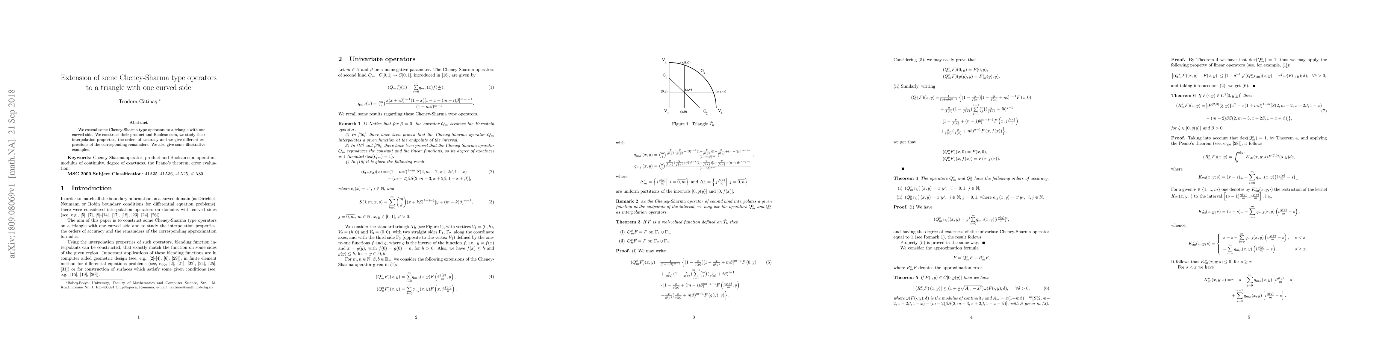 This paper extends Cheney-Sharma type operators to triangles with one curved side, exploring their product, Boolean sum, interpolation properties, accuracy orders, and remainder expressions, with illustrative examples provided.