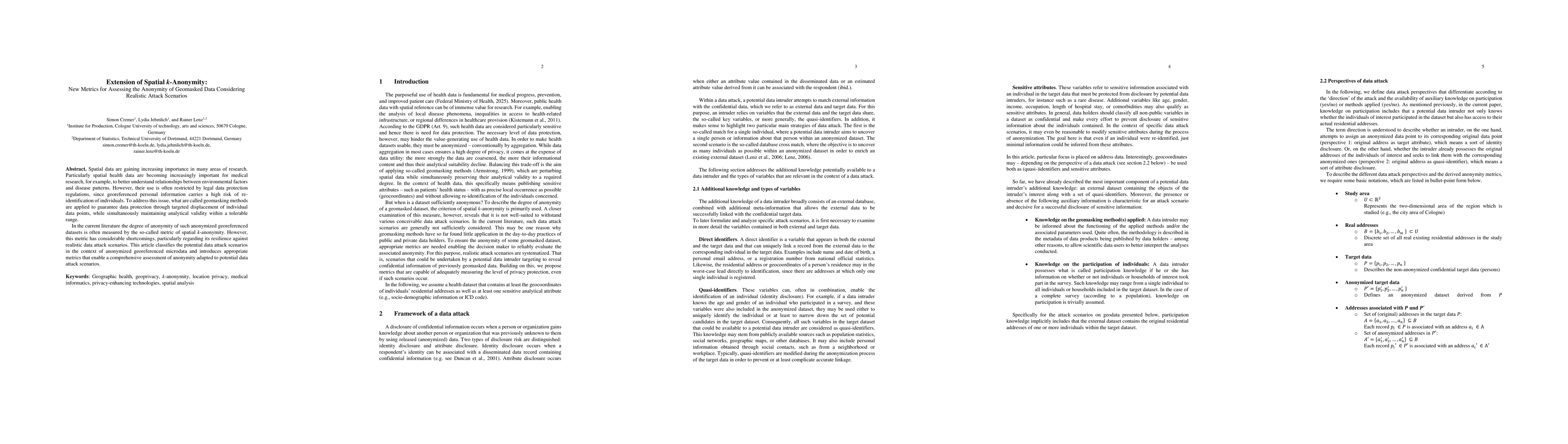 Spatial data are gaining increasing importance in many areas of research. Particularly spatial health data are becoming increasingly important for medical research, for example, to better understand relationships between environmental factors and disease patterns. However, their use is often restricted by legal data protection regulations, since georeferenced personal information carries a high risk of re-identification of individuals. To address this issue, what are called geomasking methods are applied to guarantee data protection through targeted displacement of individual data points, while simultaneously maintaining analytical validity within a tolerable range. In the current literature the degree of anonymity of such anonymized georeferenced datasets is often measured by the so-called metric of spatial k-anonymity. However, this metric has considerable shortcomings, particularly regarding its resilience against realistic data attack scenarios. This article classifies the potential data attack scenarios in the context of anonymized georeferenced microdata and introduces appropriate metrics that enable a comprehensive assessment of anonymity adapted to potential data attack scenarios.