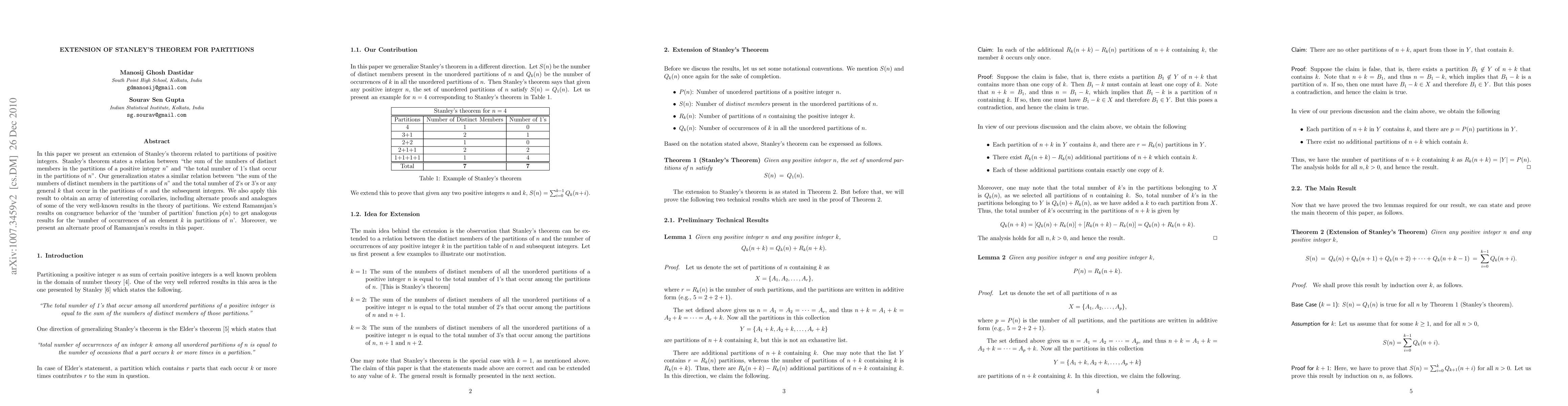 In this paper we present an extension of Stanley's theorem related to partitions of positive integers. Stanley's theorem states a relation between "the sum of the numbers of distinct members in the partitions of a positive integer $n$" and "the total number of 1's that occur in the partitions of $n$". Our generalization states a similar relation between "the sum of the numbers of distinct members in the partitions of $n$" and the total number of 2's or 3's or any general $k$ that occur in the partitions of $n$ and the subsequent integers. We also apply this result to obtain an array of interesting corollaries, including alternate proofs and analogues of some of the very well-known results in the theory of partitions. We extend Ramanujan's results on congruence behavior of the 'number of partition' function $p(n)$ to get analogous results for the 'number of occurrences of an element $k$ in partitions of $n$'. Moreover, we present an alternate proof of Ramanujan's results in this paper.