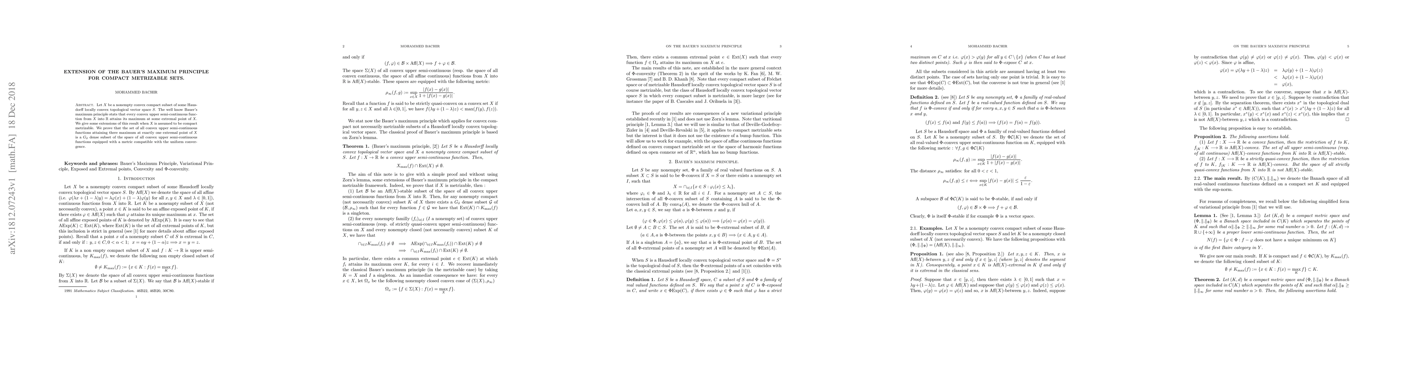 A research paper extends Bauer's maximum principle to compact metrizable sets, showing that a subset of convex upper semi-continuous functions attains their maximum at exactly one extremal point is dense in the space of all such functions.