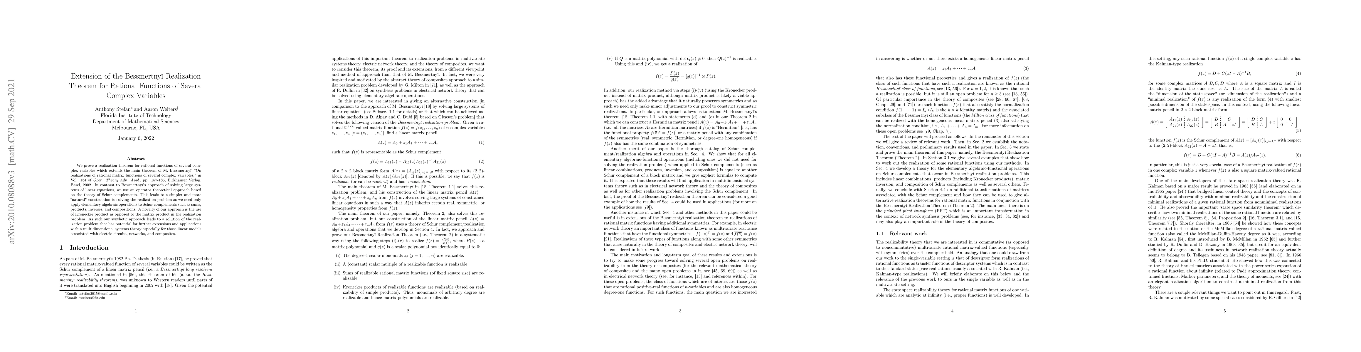 This paper extends Bessmertnyi's realization theorem for rational functions of several complex variables using an operator theoretical approach based on Schur complements, simplifying the realization process. The novel use of Kronecker products instead of matrix products enhances the method's potential for applications in multidimensional systems theory.