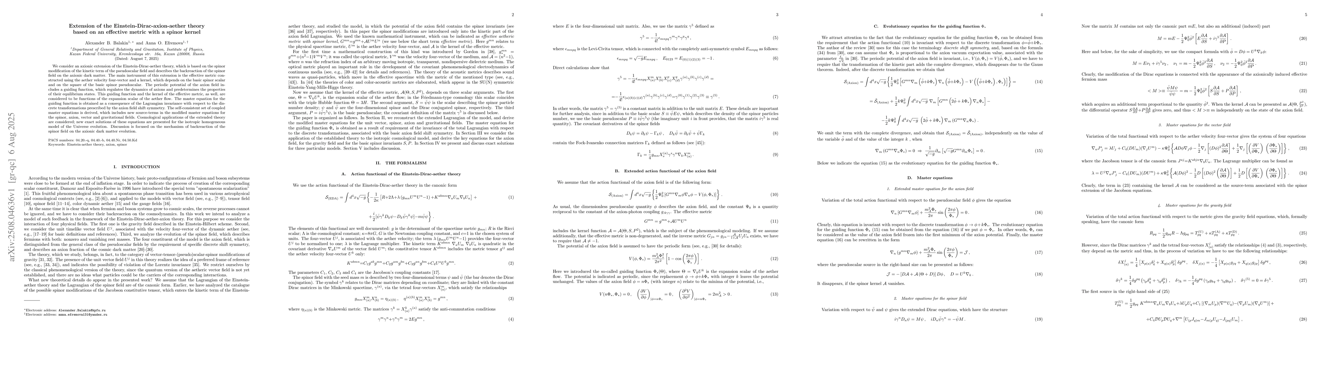 We consider an axionic extension of the Einstein-Dirac-aether theory, which is based on the spinor modification of the kinetic term of the pseudoscalar field and describes the backreaction of the spinor field on the axionic dark matter. The main instrument of this extension is the effective metric constructed using the aether velocity four-vector and a kernel, which depends on the basic spinor scalar and on the square of the basic spinor pseudoscalar. The periodic potential of the axion field includes a guiding function, which regulates the dynamics of axions and predetermines the properties of their equilibrium states. This guiding function and the kernel of the effective metric, as well, are considered to be functions of the expansion scalar of the aether flow. The master equation for the guiding function is obtained as a consequence of the Lagrangian invariance with respect to the discrete transformations prescribed by the axion field shift symmetry. The self-consistent set of coupled master equations is derived, which includes new source-terms in the modified master equations for the spinor, axion, vector and gravitational fields. Cosmological applications of the extended theory are considered; new exact solutions of these equations are presented for the isotropic homogeneous model of the Universe evolution. Discussion is focused on the mechanism of backreaction of the spinor field on the axionic dark matter evolution.