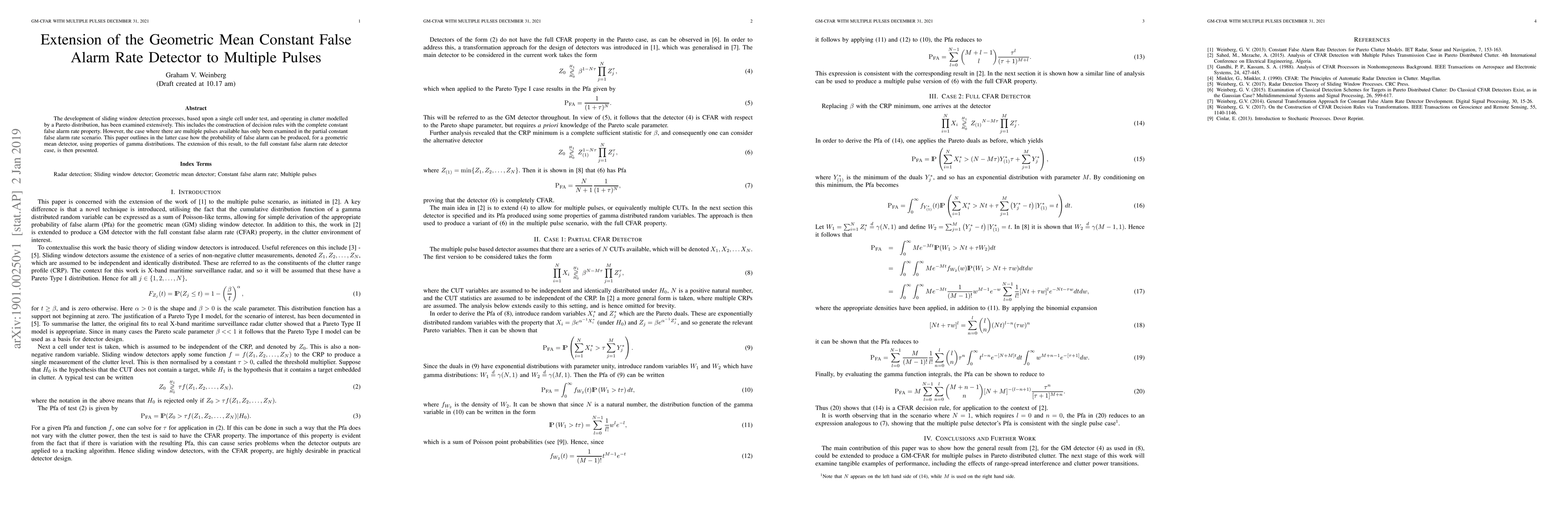 The development of sliding window detection processes, based upon a single cell under test, and operating in clutter modelled by a Pareto distribution, has been examined extensively. This includes the construction of decision rules with the complete constant false alarm rate property. However, the case where there are multiple pulses available has only been examined in the partial constant false alarm rate scenario. This paper outlines in the latter case how the probability of false alarm can be produced, for a geometric mean detector, using properties of gamma distributions. The extension of this result, to the full constant false alarm rate detector case, is then presented.