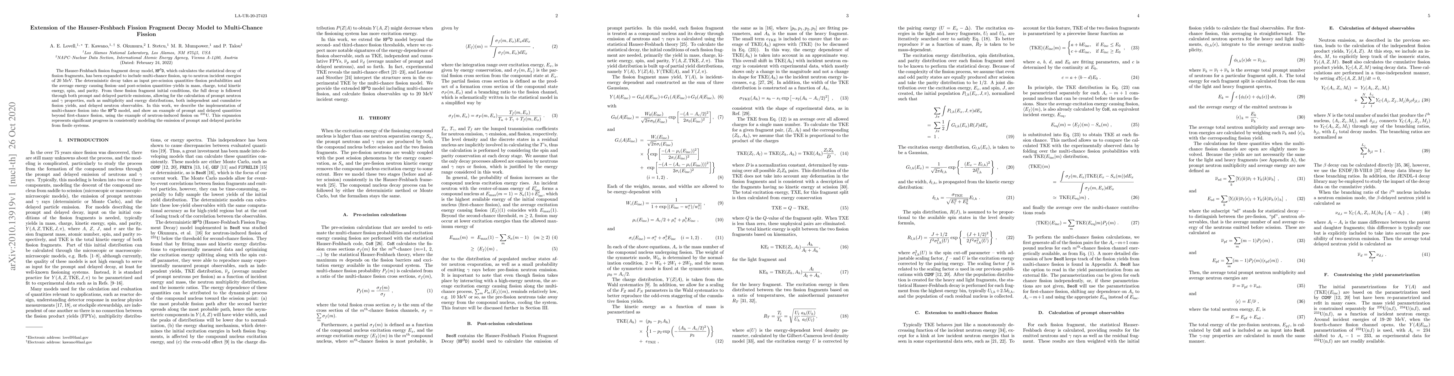 The research extends the Hauser-Feshbach fission fragment decay model, HF^3D, to include multi-chance fission, up to 20 MeV neutron incident energies. It calculates the statistical decay of fission fragments using pre-scission quantities and post-scission quantities, allowing for the calculation of various observables like prompt and delayed neutron and gamma properties.