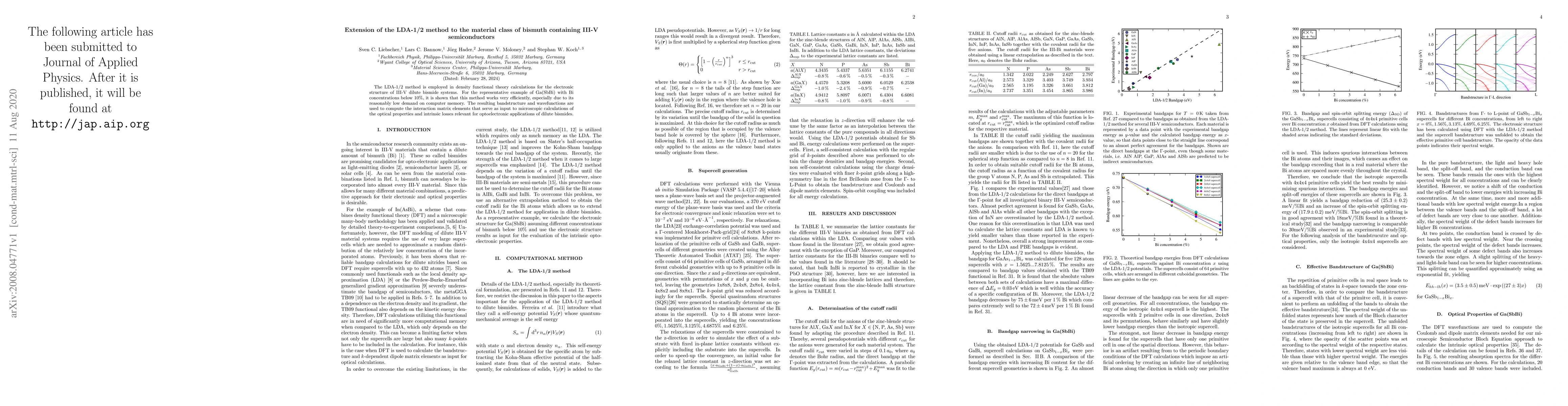 The LDA-1/2 method is employed in density functional theory calculations for the electronic structure of III-V dilute bismide systems. For the representative example of Ga(SbBi) with Bi concentrations below $10 \%$, it is shown that this method works very efficiently, especially due to its reasonably low demand on computer memory. The resulting bandstructure and wavefunctions are used to compute the interaction matrix elements that serve as input to microscopic calculations of the optical properties and intrinsic losses relevant for optoelectronic applications of dilute bismides.