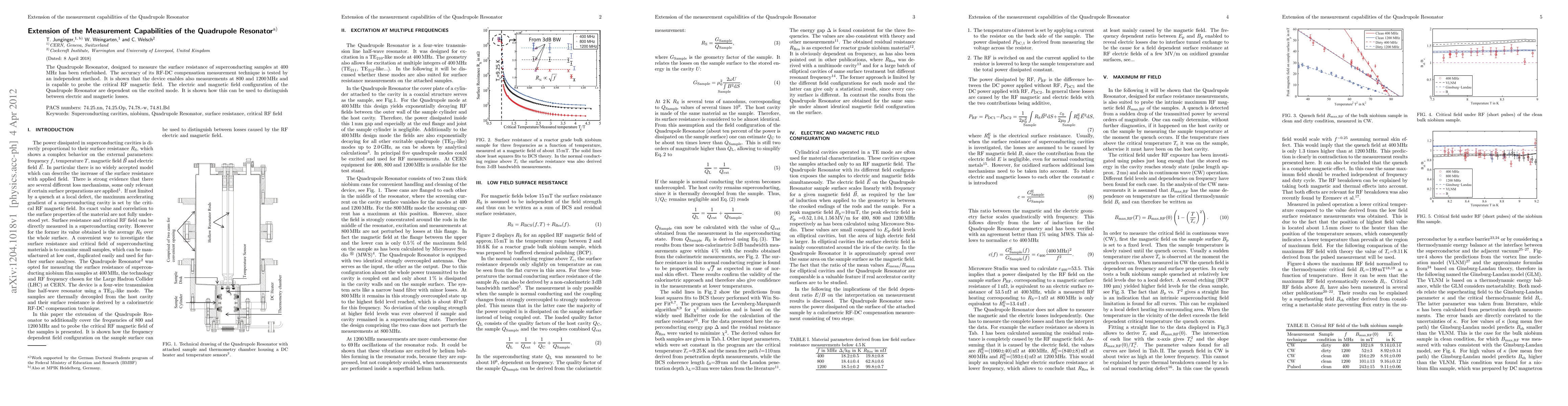 The Quadrupole Resonator, designed to measure the surface resistance of superconducting samples at 400 MHz has been refurbished. The accuracy of its RF-DC compensation measurement technique is tested by an independent method. It is shown that the device enables also measurements at 800 and 1200 MHz and is capable to probe the critical RF magnetic field. The electric and magnetic field configuration of the Quadrupole Resonator are dependent on the excited mode. It is shown how this can be used to distinguish between electric and magnetic losses.