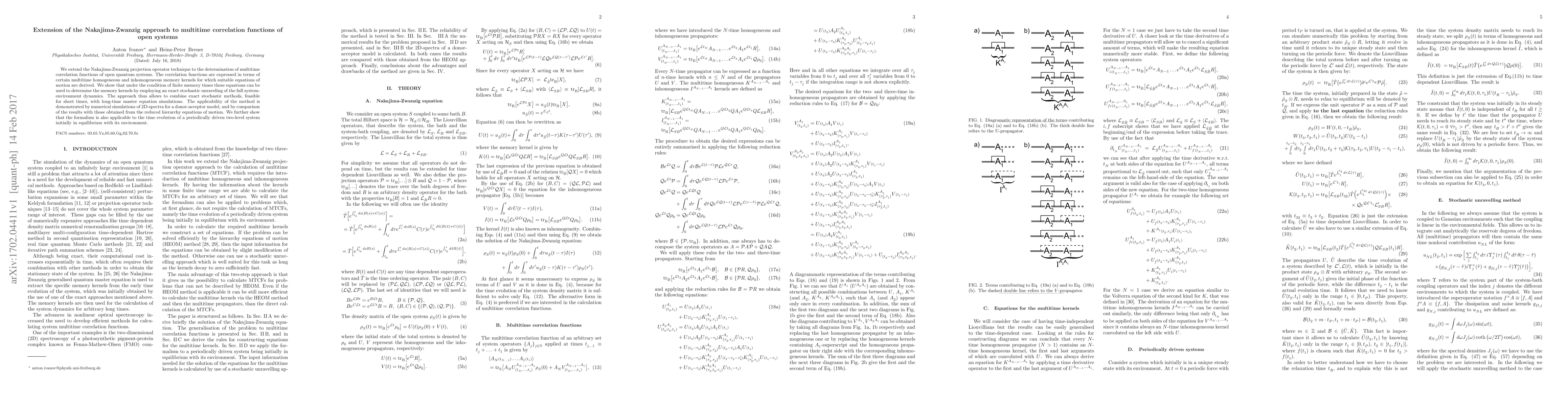 This paper extends the Nakajima-Zwanzig projection operator technique to derive multitime correlation functions for open quantum systems, providing equations of motion for memory kernels that enable combining exact stochastic methods with long-time master equation simulations. The method is demonstrated through numerical simulations of 2D-spectra and its applicability to periodically driven systems.