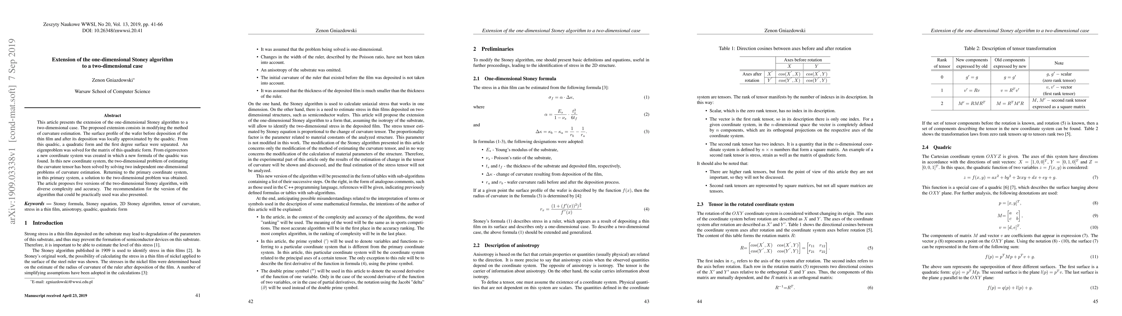 This article presents the extension of the one-dimensional Stoney algorithm to a two-dimensional case. The proposed extension consists in modifying the method of curvature estimation. The surface profile of the wafer before deposition of the thin film and after its deposition was locally approximated by the quadric. From this quadric, a quadratic form and the first degree surface were separated. An eigenproblem was solved for the matrix of this quadratic form. From eigenvectors a new coordinate system was created in which a new formula of the quadric was found. In this new coordinate system, the two-dimensional problem of estimating the curvature tensor has been solved by solving two independent one-dimensional problems of curvature estimation. Returning to the primary coordinate system, in this primary coordinate system, a solution to the two-dimensional problem was obtained. The article proposed five versions of the two-dimensional Stoney algorithm, with diverse complexity and accuracy. The recommendation for the version of the algorithm that could be practically used was also presented.