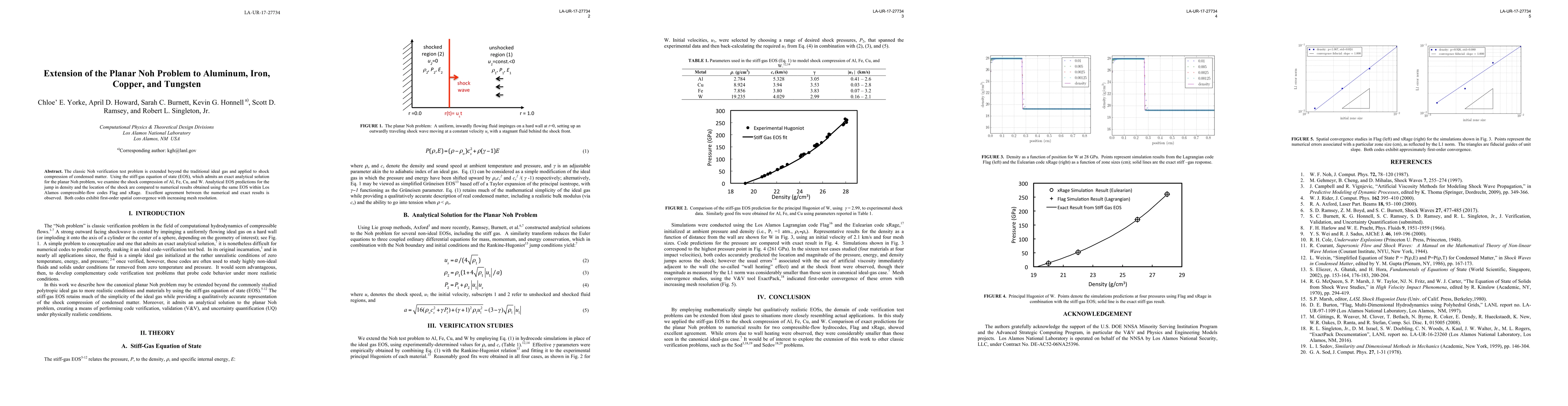 The classic Noh verification test problem is extended beyond the traditional ideal gas and applied to shock compression of condensed matter. Using the stiff-gas equation of state (EOS), which admits an exact analytical solution for the planar Noh problem, we examine the shock compression of Al, Fe, Cu, and W. Analytical EOS predictions for the jump in density and the location of the shock are compared to numerical results obtained using the same EOS within Los Alamos compressible-flow codes Flag and xRage. Excellent agreement between the numerical and exact results is observed. Both codes exhibit first-order spatial convergence with increasing mesh resolution.