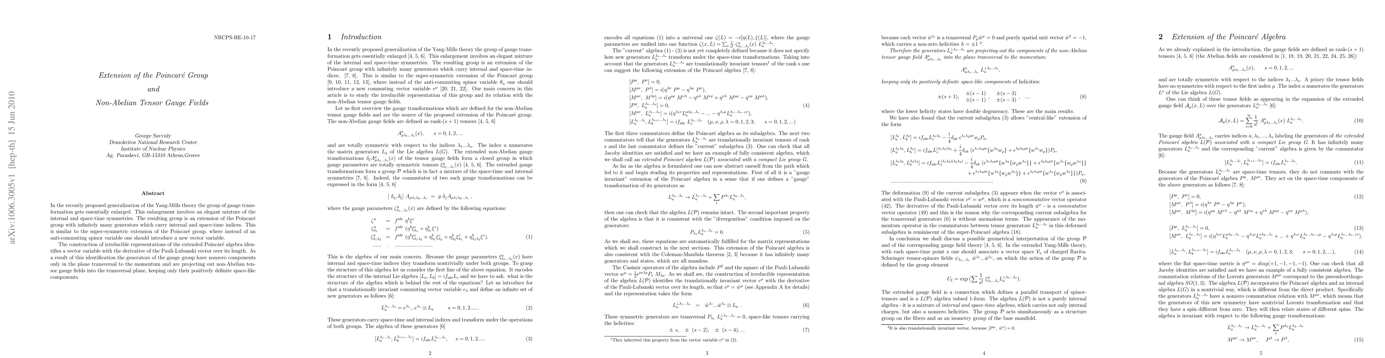 In the recently proposed generalization of the Yang-Mills theory the group of gauge transformation gets essentially enlarged. This enlargement involves an elegant mixture of the internal and space-time symmetries. The resulting group is an extension of the Poincar\'e group with infinitely many generators which carry internal and space-time indices. This is similar to the super-symmetric extension of the Poincar\'e group, where instead of an anti-commuting spinor variable one should introduce a new vector variable. The construction of irreducible representations of the extended Poincar\'e algebra identifies a vector variable with the derivative of the Pauli-Lubanski vector over its length. As a result of this identification the generators of the gauge group have nonzero components only in the plane transversal to the momentum and are projecting out non-Abelian tensor gauge fields into the transversal plane, keeping only their positively definite space-like components.
