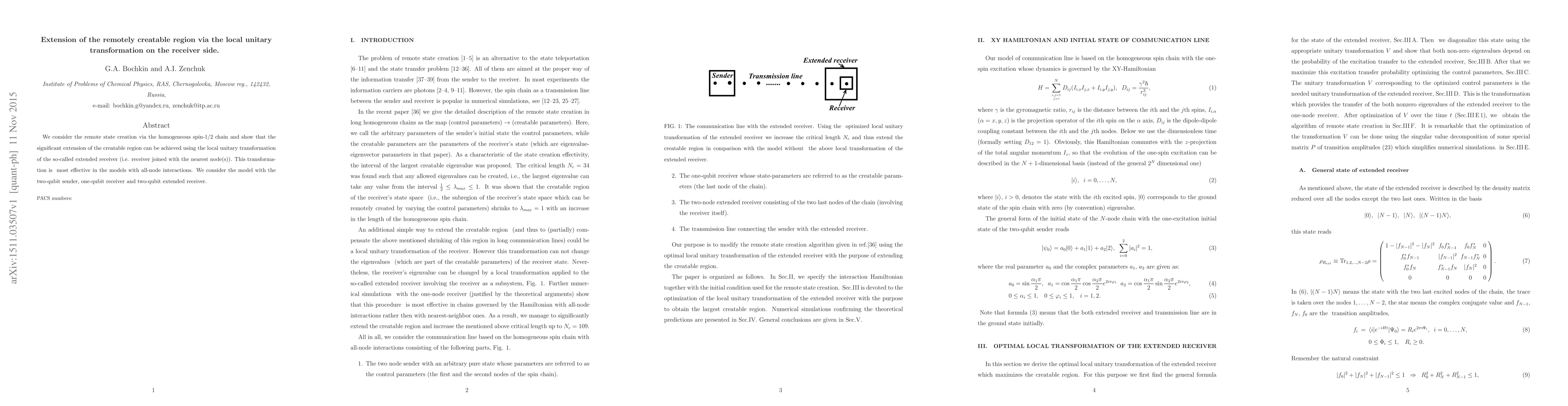 We consider the remote state creation via the homogeneous spin-1/2 chain and show that the significant extension of the creatable region can be achieved using the local unitary transformation of the so-called extended receiver (i.e. receiver joined with the nearest node(s)). This transformation is { most} effective in the models with all-node interactions. We consider the model with the two-qubit sender, one-qubit receiver and two-qubit extended receiver.