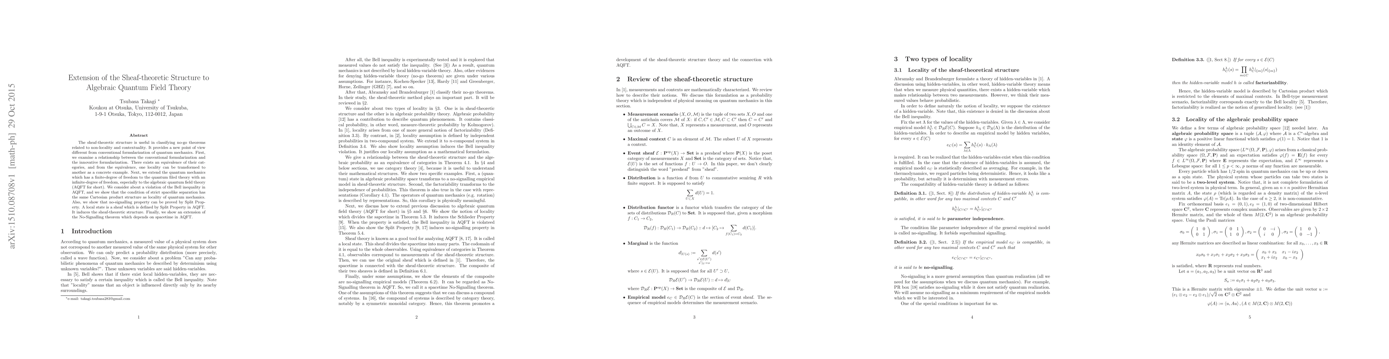 The sheaf-theoretic structure is useful in classifying no-go theorems related to non-locality and contextuality. It provides a new point of view different from conventional formularization of quantum mechanics. First, we examine a relationship between the conventional formularization and the innovative formularization. There exists an equivalence of their categories, and from the equivalence, one locality can be transformed to another as a concrete example. Next, we extend the quantum mechanics which has a finite-degree of freedom to the quantum filed theory with an infinite-degree of freedom, especially to the algebraic quantum field theory (AQFT for short). We consider about a violation of the Bell inequality in AQFT, and we show that the condition of strict spacelike separation has the same Cartesian product structure as locality of quantum mechanics. Also, we show that no-signalling property can be proved by Split Property. A local state is a sheaf which is defined by Split Property in AQFT. It induces the sheaf-theoretic structure. Finally, we show an extension of the No-Signalling theorem which depends on spacetime in AQFT.