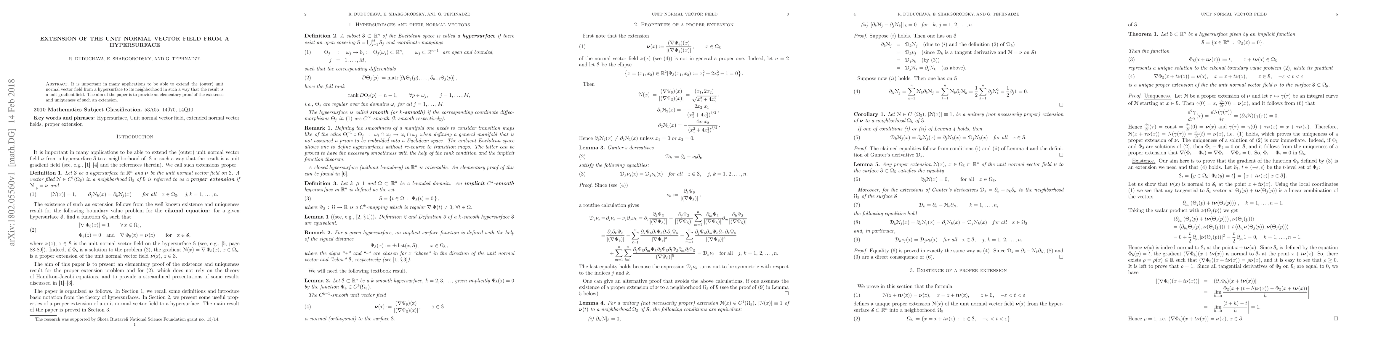 Researchers provide a proof that a unit normal vector field can be uniquely extended from a hypersurface to its neighborhood, creating a unit gradient field.