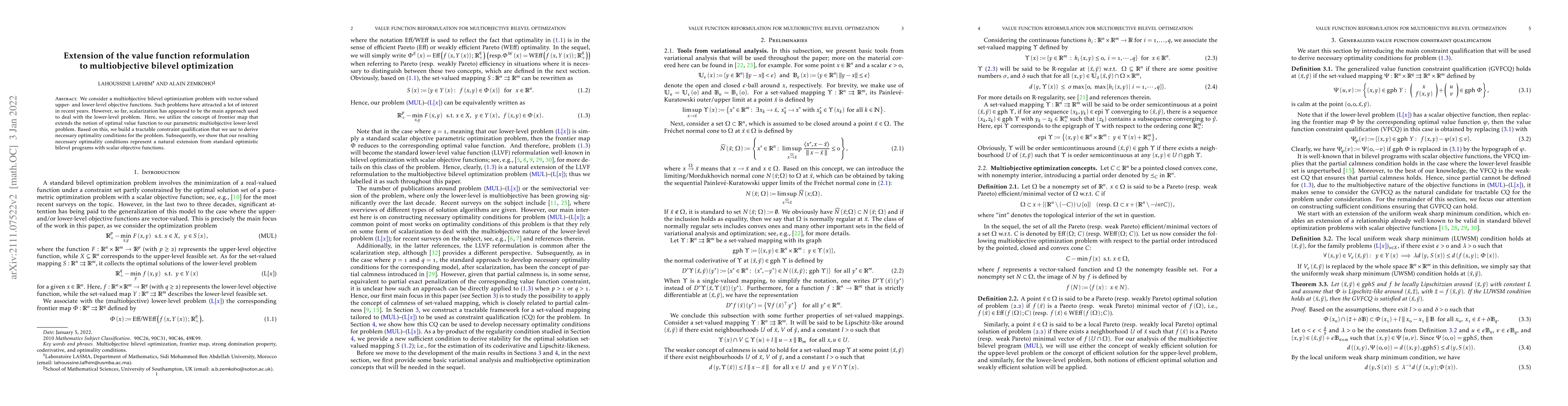This paper extends the value function reformulation to multiobjective bilevel optimization, employing a frontier map to handle vector-valued objectives. It derives necessary optimality conditions for the problem, showing they naturally extend from standard bilevel programs with scalar objectives.