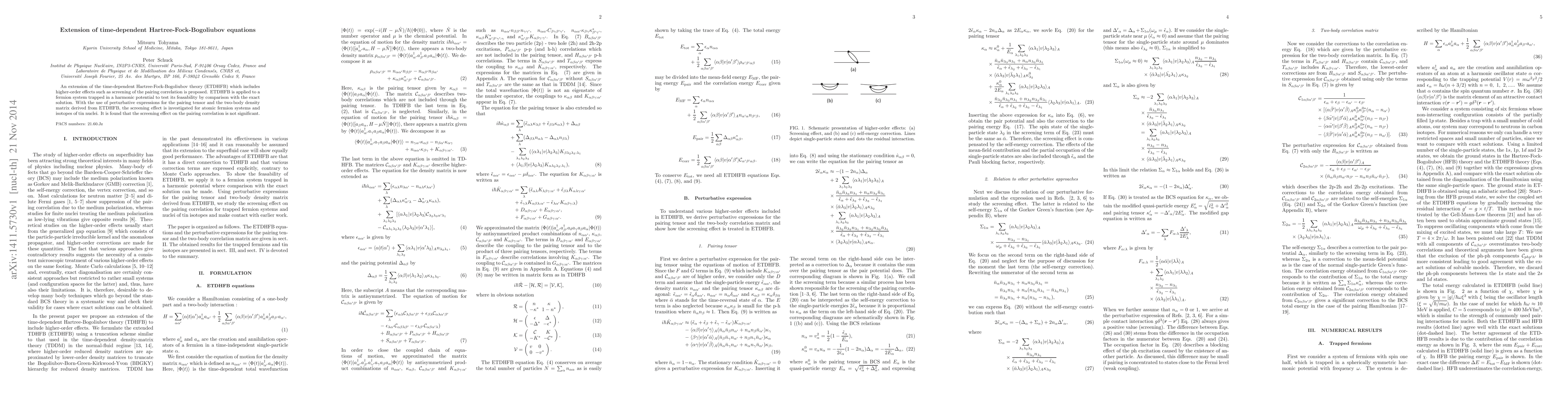The paper proposes an extension of the time-dependent Hartree-Fock-Bogoliubov theory (ETDHFB) to include higher-order effects like screening of pairing correlations. The extended model is tested on fermion systems in harmonic potentials, showing that the screening effect on pairing correlations is negligible.