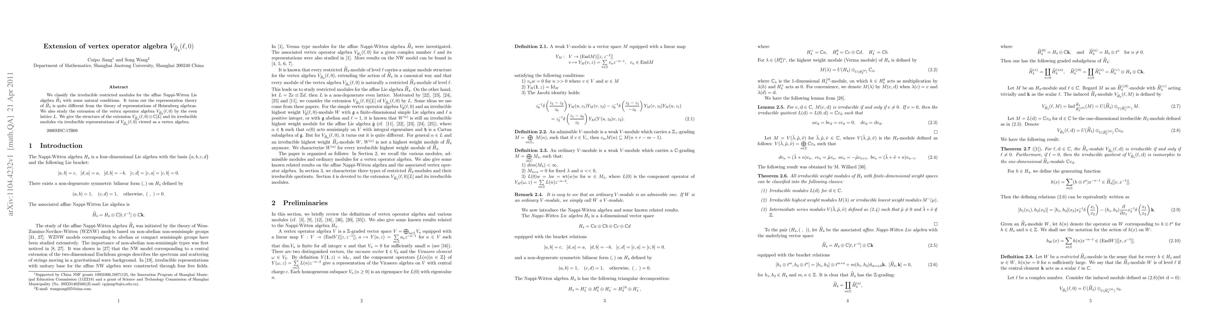 This paper classifies irreducible restricted modules for the affine Nappi-Witten Lie algebra $\hat{H}_{4}$ and finds its representation theory differs from that of Heisenberg algebras. It also explores the extension of the vertex operator algebra $V_{\hat{H}_{4}}(\ell,0)$ by the even lattice $L$, providing the structure of the extension and its irreducible modules.