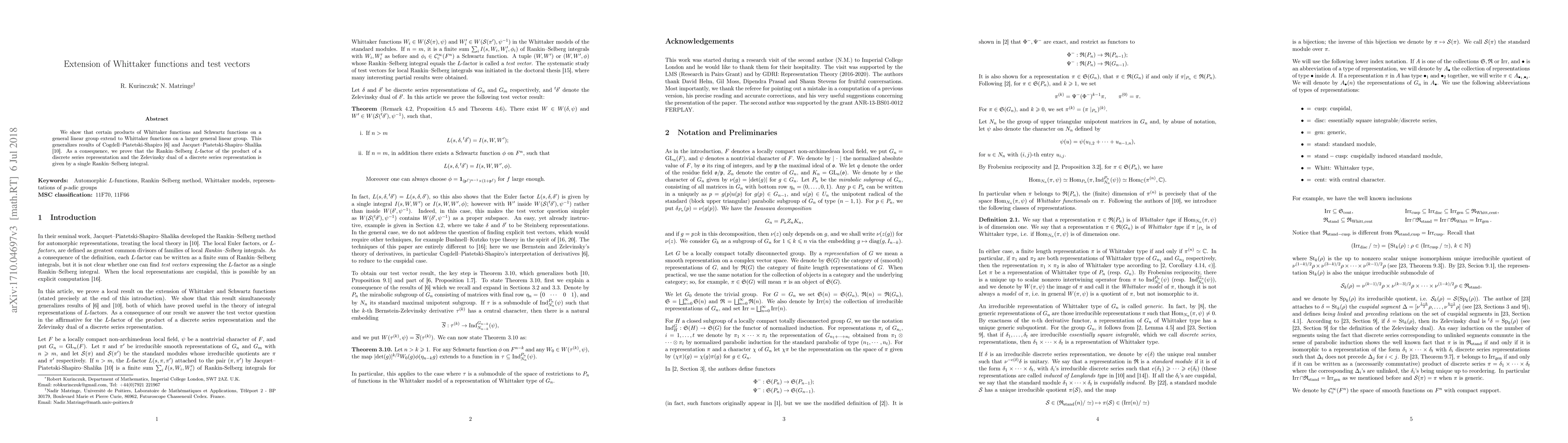 This paper extends Whittaker functions and Schwartz functions on a general linear group to larger groups, generalizing prior work by Cogdell-Piatetski-Shapiro and Jacquet-Piatetski-Shapiro-Shalika. It also establishes a new expression for the Rankin-Selberg $L$-factor involving discrete series representations and their Zelevinsky duals.