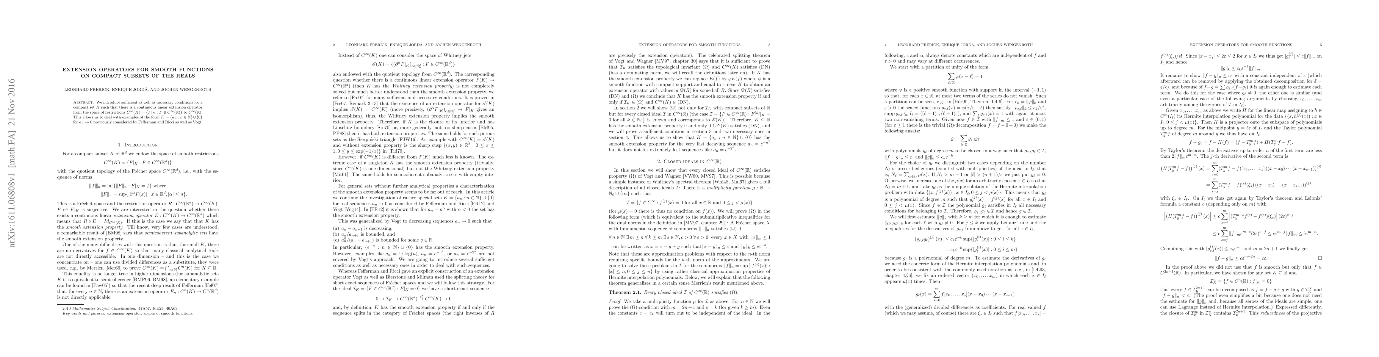 A study on extension operators for smooth functions on compact subsets of the reals introduces necessary conditions for such extensions to exist, with implications for dealing with specific types of compact sets like those considered by Fefferman and Ricci.