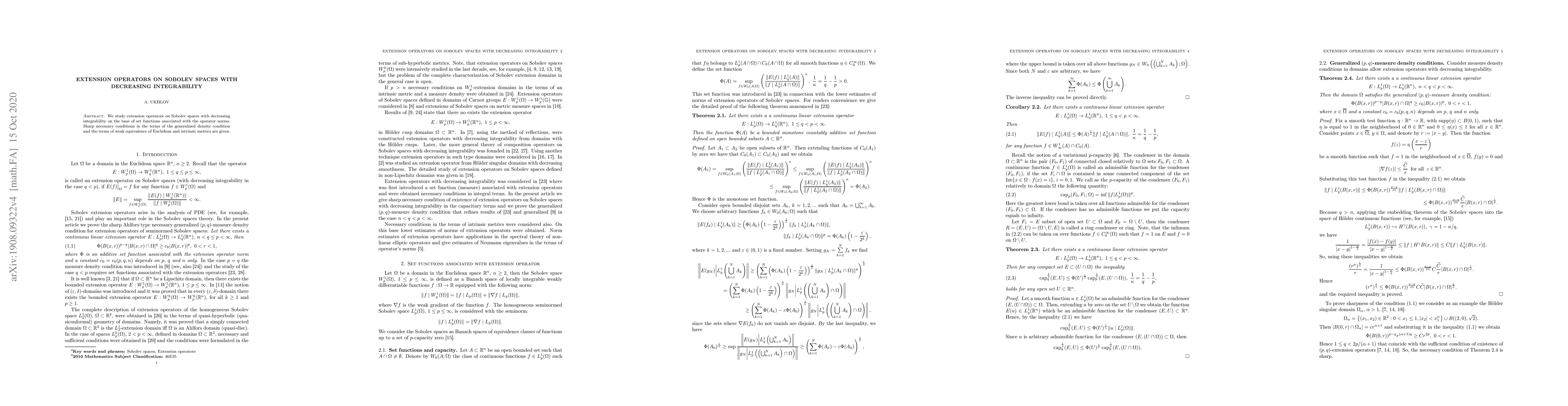 We study extension operators on Sobolev spaces with decreasing integrability on the base of set functions associated with the operator norms. Sharp necessary conditions in the terms of the generalized density condition and the terms of weak equivalence of Euclidean and intrinsic metrics are given.