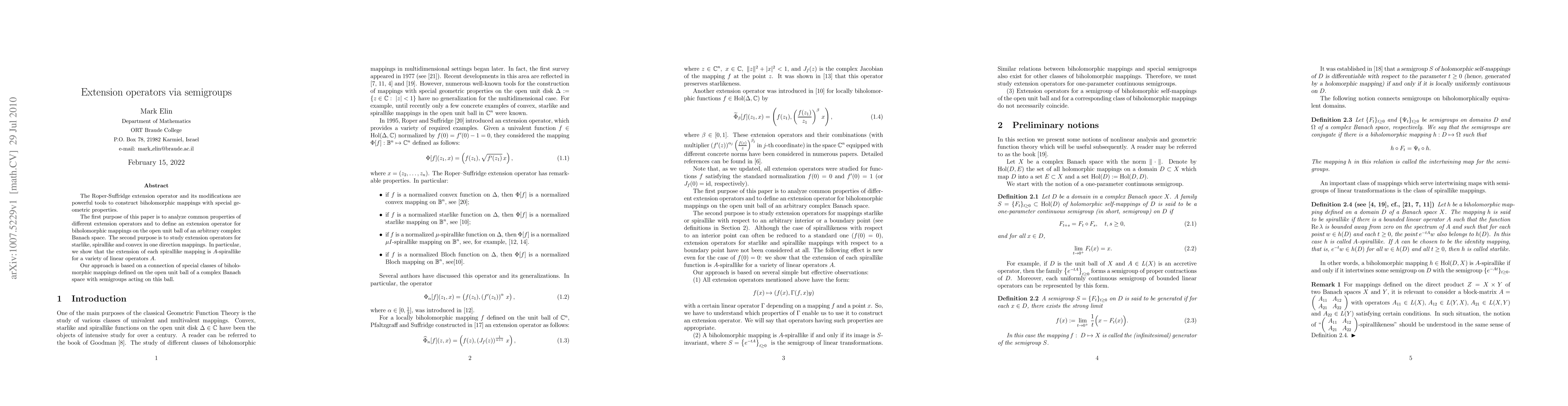 The Roper--Suffridge extension operator and its modifications are powerful tools to construct biholomorphic mappings with special geometric properties. The first purpose of this paper is to analyze common properties of different extension operators and to define an extension operator for biholomorphic mappings on the open unit ball of an arbitrary complex Banach space. The second purpose is to study extension operators for starlike, spirallike and convex in one direction mappings. In particular, we show that the extension of each spirallike mapping is $A$-spirallike for a variety of linear operators $A$. Our approach is based on a connection of special classes of biholomorphic mappings defined on the open unit ball of a complex Banach space with semigroups acting on this ball.