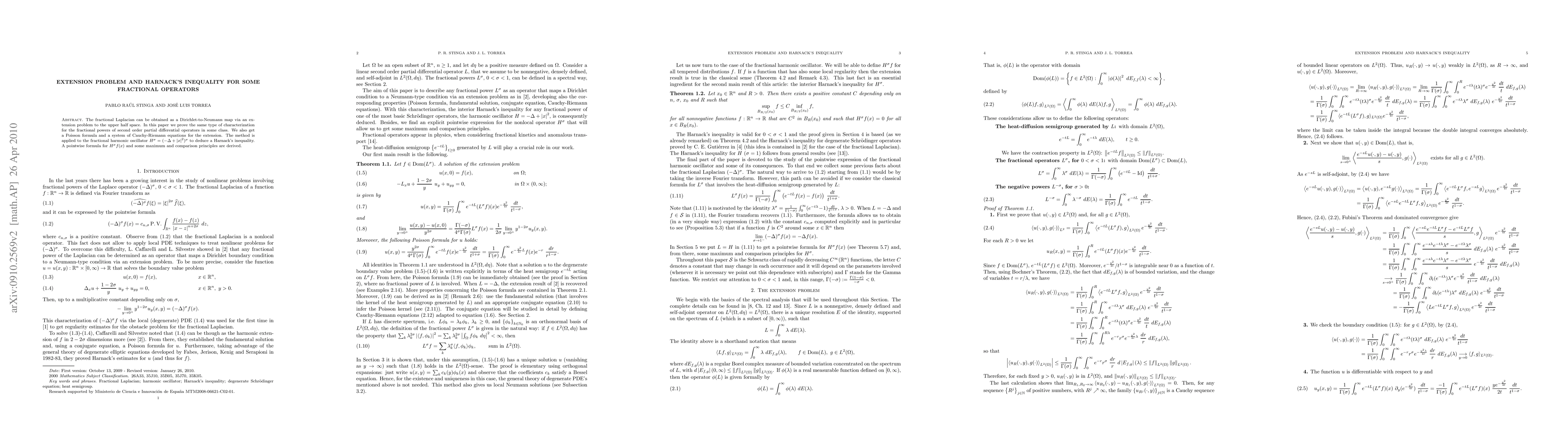 This paper characterizes fractional powers of second-order partial differential operators via an extension problem and proves a Harnack's inequality for the fractional harmonic oscillator. It also derives a Poisson formula, Cauchy-Riemann equations, and pointwise expressions for the operator.