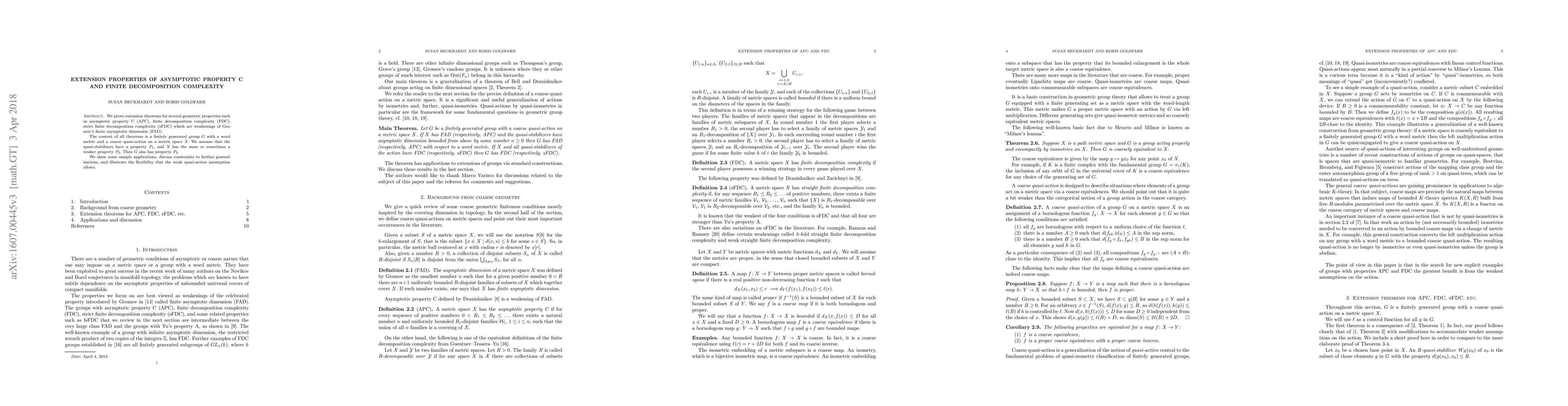 We prove extension theorems for several geometric properties such as asymptotic property C (APC), finite decomposition complexity (FDC), strict finite decomposition complexity (sFDC) which are weakenings of Gromov's finite asymptotic dimension (FAD). The context of all theorems is a finitely generated group $G$ with a word metric and a coarse quasi-action on a metric space $X$. We assume that the quasi-stabilizers have a property $P_1$, and $X$ has the same or sometimes a weaker property $P_2$. Then $G$ also has property $P_2$. We show some sample applications, discuss constraints to further generalizations, and illustrate the flexibility that the weak quasi-action assumption allows.