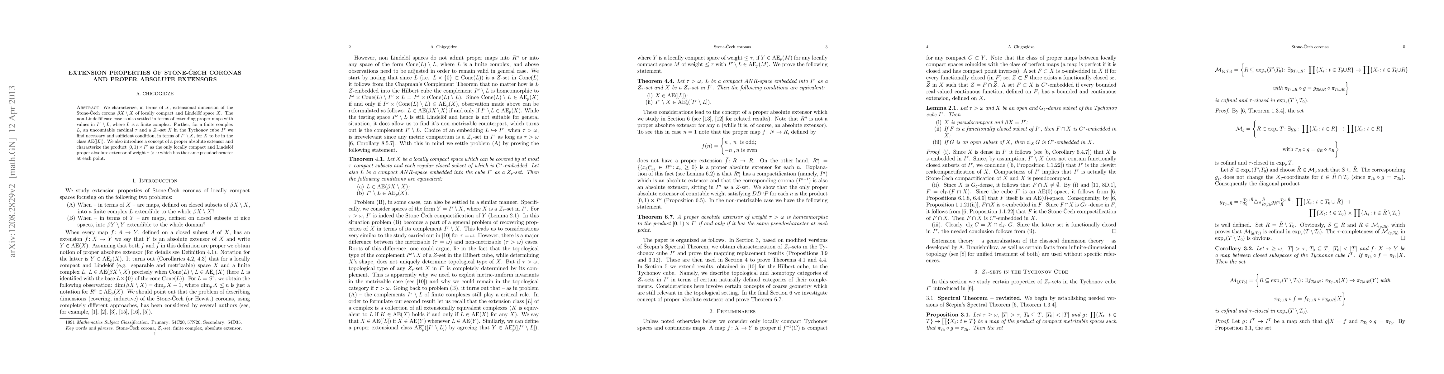 We characterize, in terms of $X$, extensional dimension of the Stone-\v{C}ech corona $\beta X \setminus X$ of locally compact and Lindel\"{o}f space $X$. The non-Lindel\"{o}f case case is also settled in terms of extending proper maps with values in $I^{\tau}\setminus L$, where $L$ is a finite complex. Further, for a finite complex $L$, an uncountable cardinal $\tau$ and a $Z_{\tau}$-set $X$ in the Tychonov cube $I^{\tau}$ we find necessary and sufficient condition, in terms of $I^{\tau}\setminus X$, for $X$ to be in the class $\operatorname{AE}([L])$. We also introduce a concept of a proper absolute extensor and characterize the product $[0,1)\times I^{\tau}$ as the only locally compact and Lindel\"{o}f proper absolute extensor of weight $\tau > \omega$ which has the same pseudocharacter at each point.