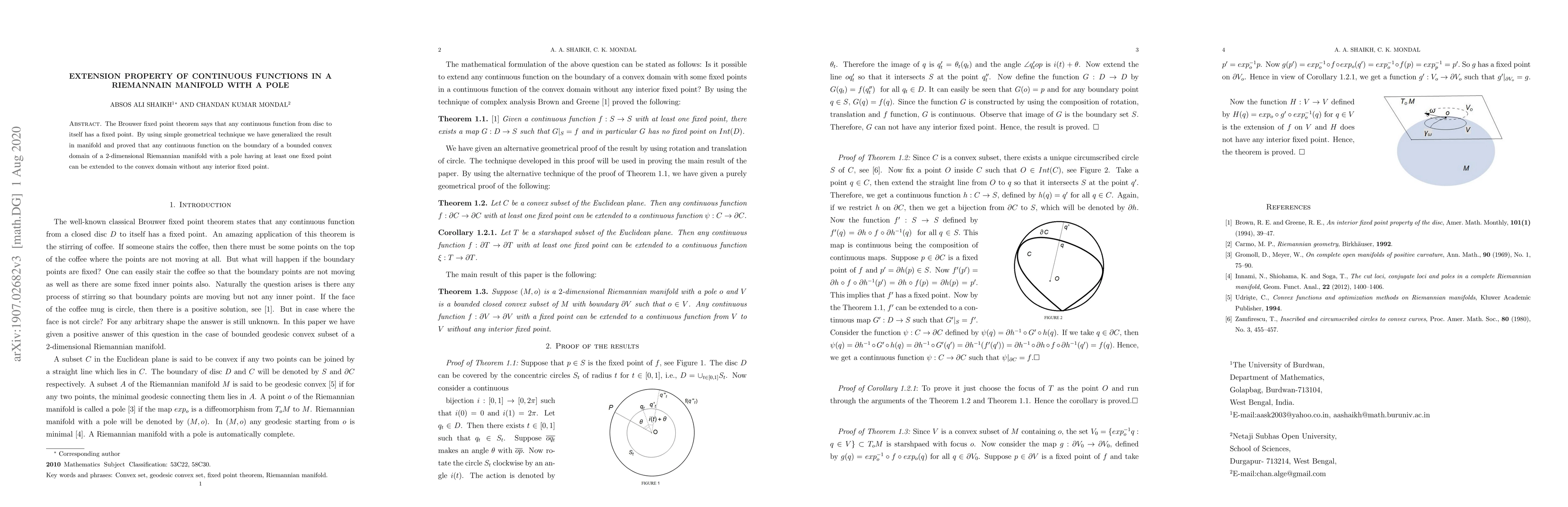 The Brouwer fixed point theorem says that any continuous function from disc to itself has a fixed point. By using simple geometrical technique we have generalized the result in manifold and proved that any continuous function on the boundary of a bounded convex domain of a $2$-dimensional Riemannian manifold with a pole having at least one fixed point can be extended to the convex domain without any interior fixed point.