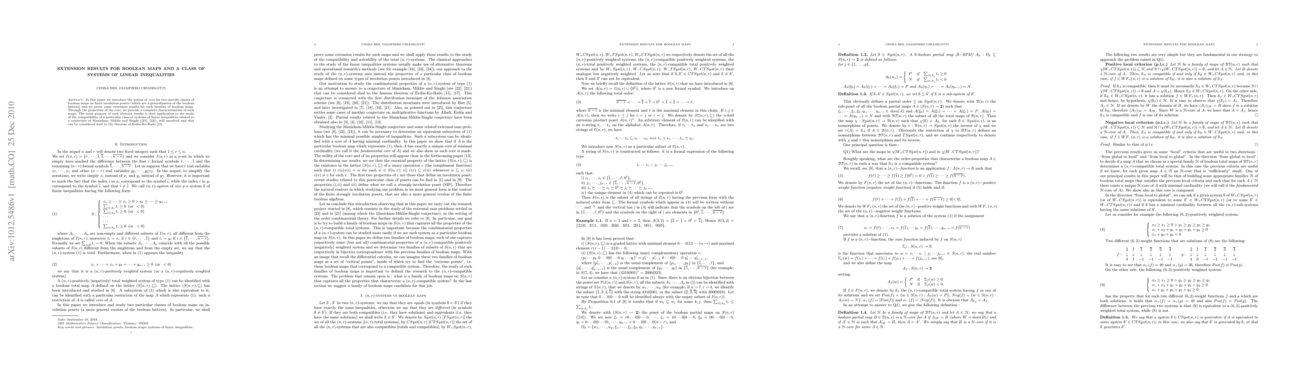 In this paper we introduce the notion of {\it core} for two specific classes of boolean maps on finite involution posets (which are a generalization of the boolean lattices) and we prove some extension results for such families of boolean maps. Through the properties of the core, we provide a complete characterization of such maps. The main purpose of such abstract results is their application to the study of the compatibility of a particular class of systems of linear inequalities related to a conjecture of Manickam, Mikl\"os and Singhi (\cite{ManSin88}, \cite{ManMik87}), still unsolved and that can be considered dual to the theorem of Erd\"os-Ko-Rado \cite{erd-ko-rad}.