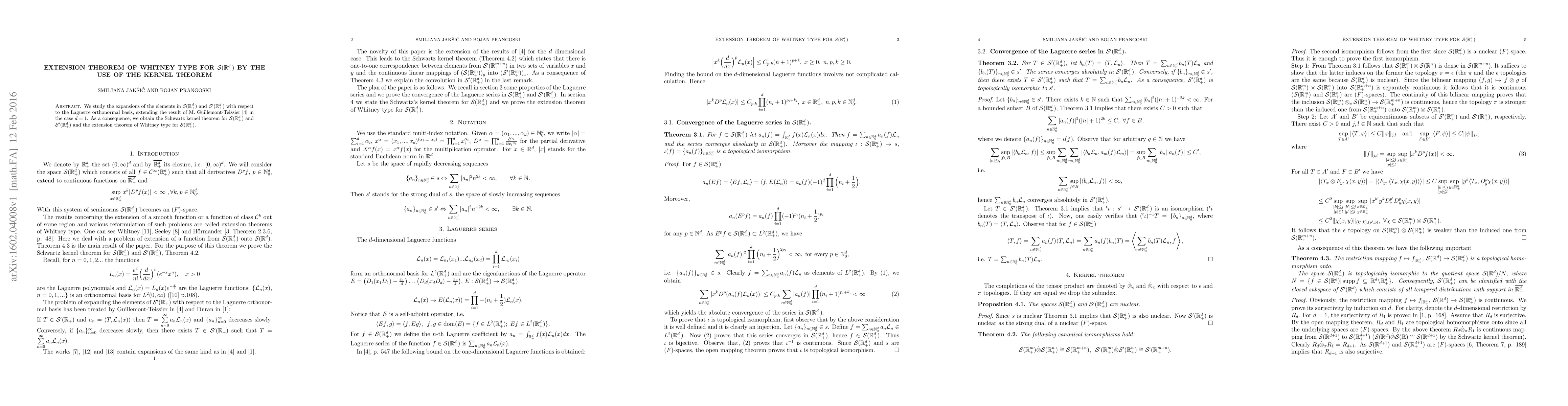 We study the expansions of the elements in $\mathcal S(\mathbb{R}_+^d)$ and $\mathcal{S}'(\mathbb{R}_+^d)$ with respect to the Laguerre orthonormal basis, extending the result of M. Guillemont-Teissier in the case $d=1$. As a consequence, we obtain the Schwartz kernel theorem for $\mathcal{S}(\mathbb{R}_+^d)$ and $\mathcal{S}'(\mathbb{R}_+^d)$ and the extension theorem of Whitney type for $\mathcal{S}(\mathbb{R}_+^d)$.