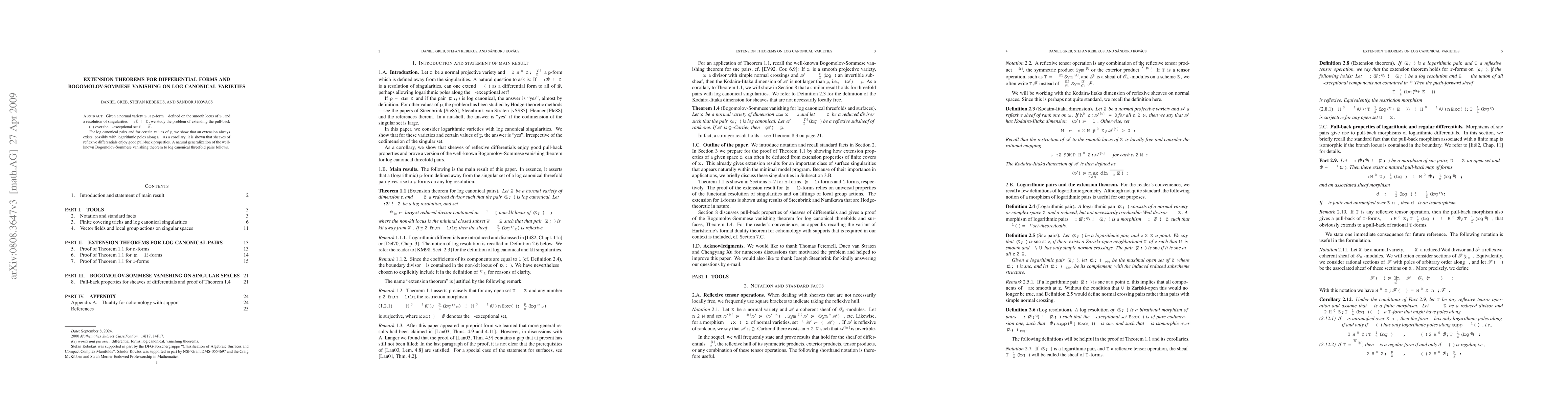Researchers show that p-forms can always be extended over the exceptional set of a desingularization for log canonical varieties, leading to good pull-back properties for sheaves of reflexive differentials and generalizing the Bogomolov-Sommese vanishing theorem.