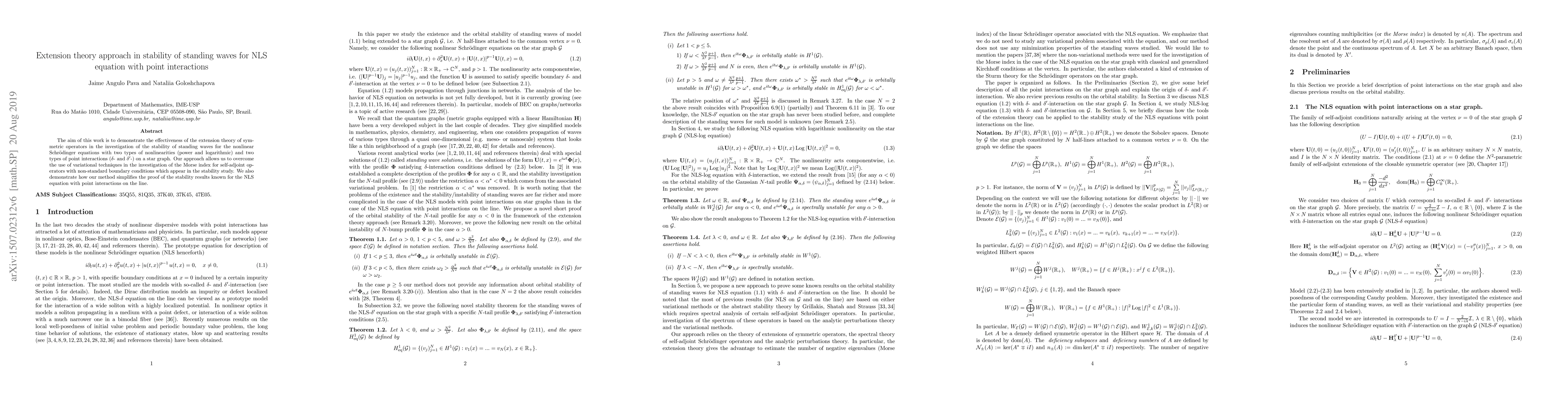 The aim of this work is to demonstrate the effectiveness of the extension theory of symmetric operators in the investigation of the stability of standing waves for the nonlinear Schr\"odinger equations with two types of non-linearities (power and logarithmic) and two types of point interactions ($\delta$- and $\delta'$-) on a star graph. Our approach allows us to overcome the use of variational techniques in the investigation of the Morse index for self-adjoint operators with non-standard boundary conditions which appear in the stability study. We also demonstrate how our method simplifies the proof of the stability results known for the NLS equation with point interactions on the line.
