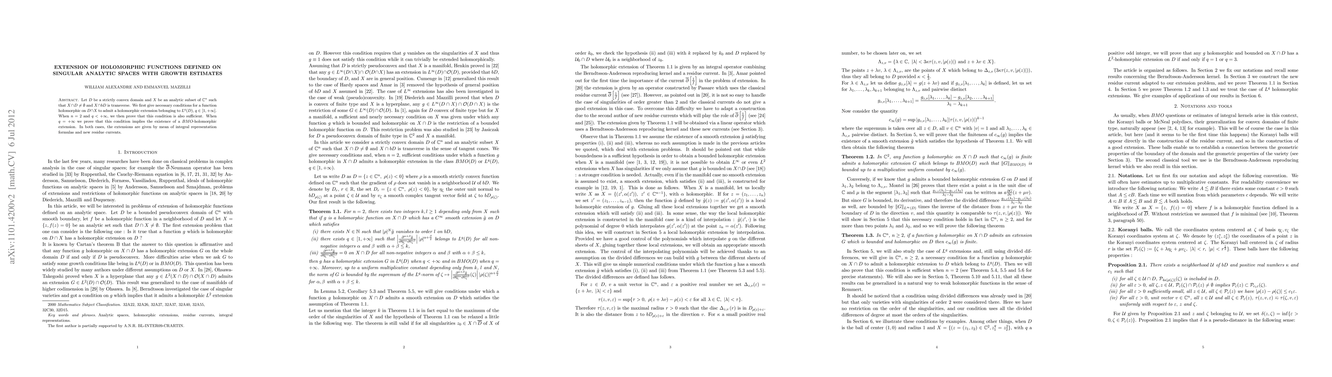 Researchers found conditions for extending holomorphic functions on intersections of domains and singular analytic sets to the entire domain with controlled growth estimates.