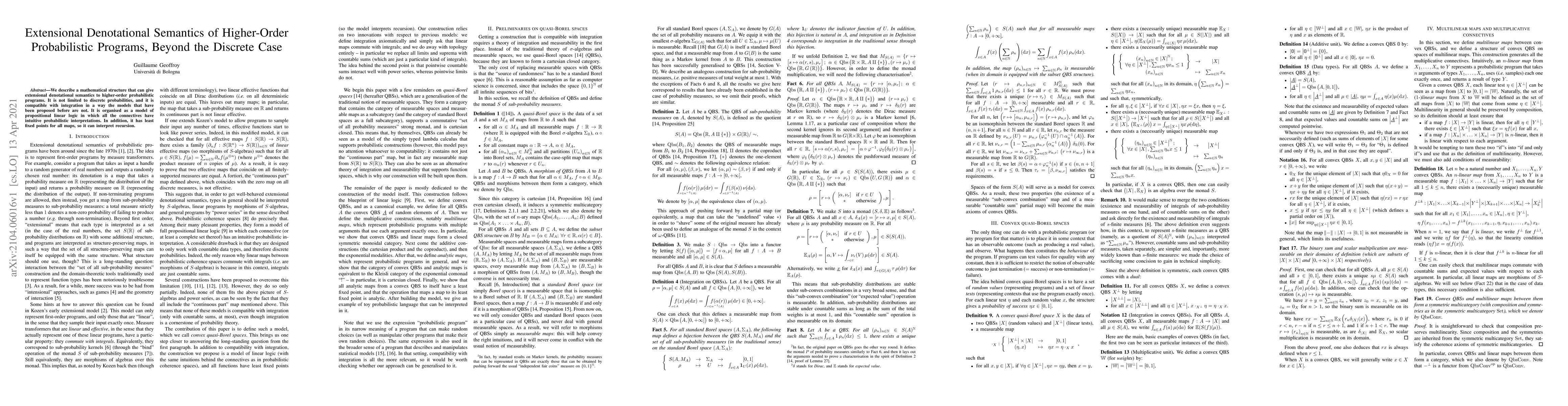 This paper introduces a mathematical framework for extensional denotational semantics of higher-order probabilistic programs, extending beyond discrete probabilities. It aligns with integration and supports recursive interpretation via least fixed points within a propositional linear logic model.