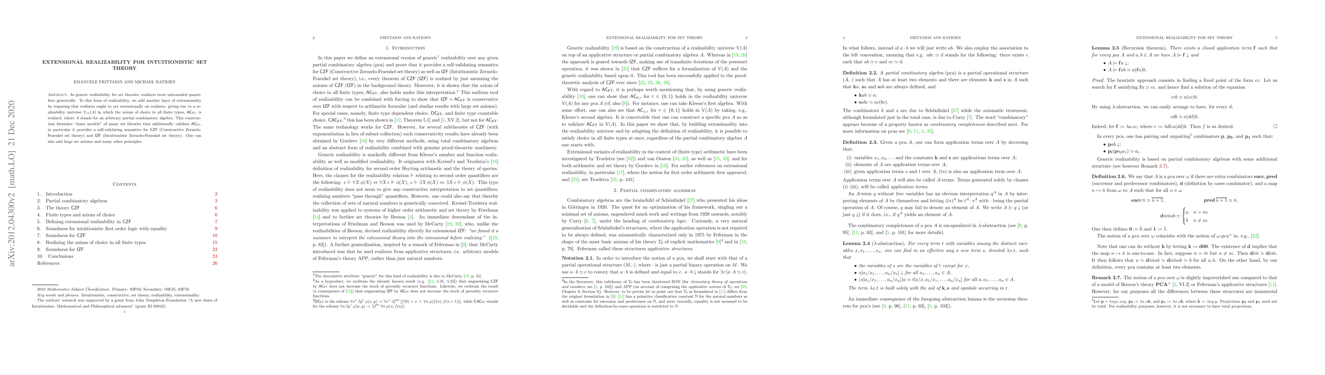 In generic realizability for set theories, realizers treat unbounded quantifiers generically. To this form of realizability, we add another layer of extensionality by requiring that realizers ought to act extensionally on realizers, giving rise to a realizability universe $\mathrm{V_{ex}}(A)$ in which the axiom of choice in all finite types ${\sf AC}_{{\sf FT}}$ is realized, where $A$ stands for an arbitrary partial combinatory algebra. This construction furnishes 'inner models' of many set theories that additionally validate ${\sf AC}_{{\sf FT}}$, in particular it provides a self-validating semantics for $\sf CZF$ (Constructive Zermelo-Fraenkel set theory) and $\sf IZF$ (Intuitionistic Zermelo-Fraenkel set theory). One can also add large set axioms and many other principles.