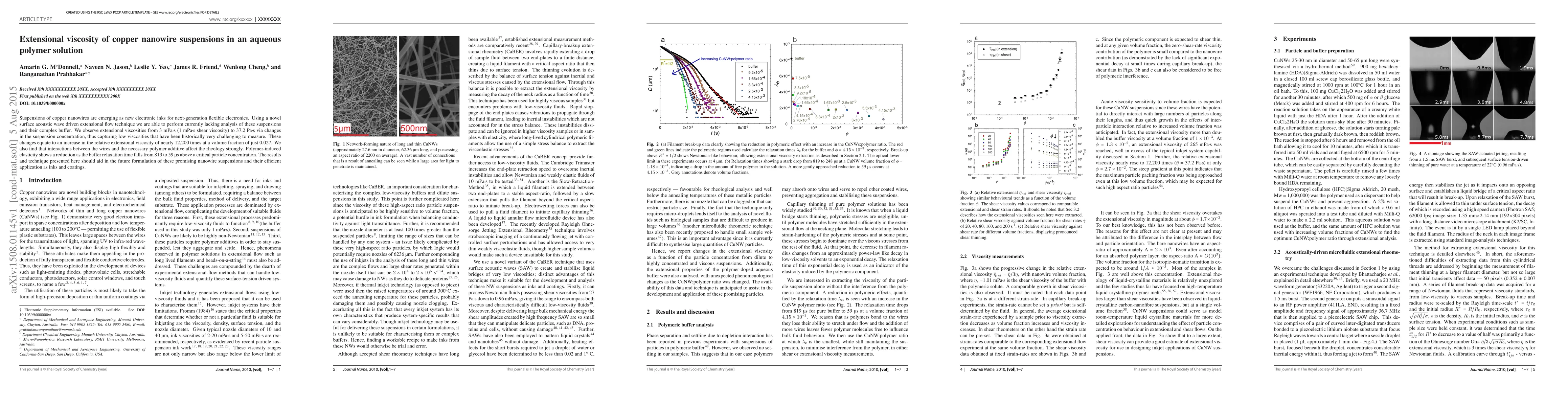 This paper investigates the extensional viscosity of copper nanowire suspensions in an aqueous polymer solution using a novel surface acoustic wave technique, revealing significant viscosity changes from 3 to 37.2 Pa·s with varying concentrations. The study highlights the strong influence of polymer additives on rheology and elasticity, providing valuable insights for developing these nanowire suspensions for flexible electronics.
