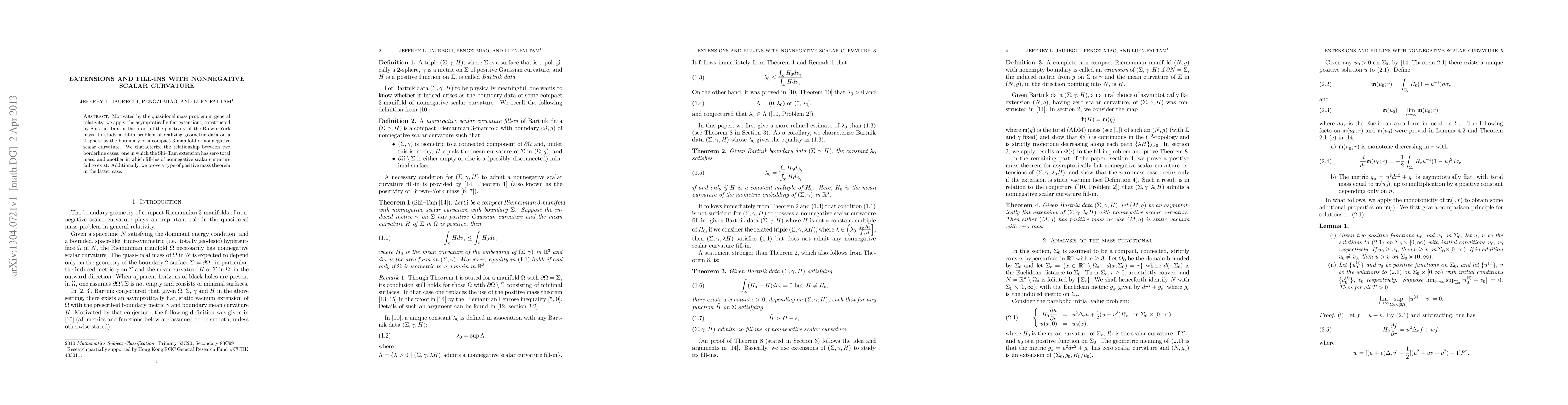 The paper presents a detailed analysis of asymptotically flat extensions and their application to the fill-in problem, along with proving a comparison principle for solutions to a PDE.