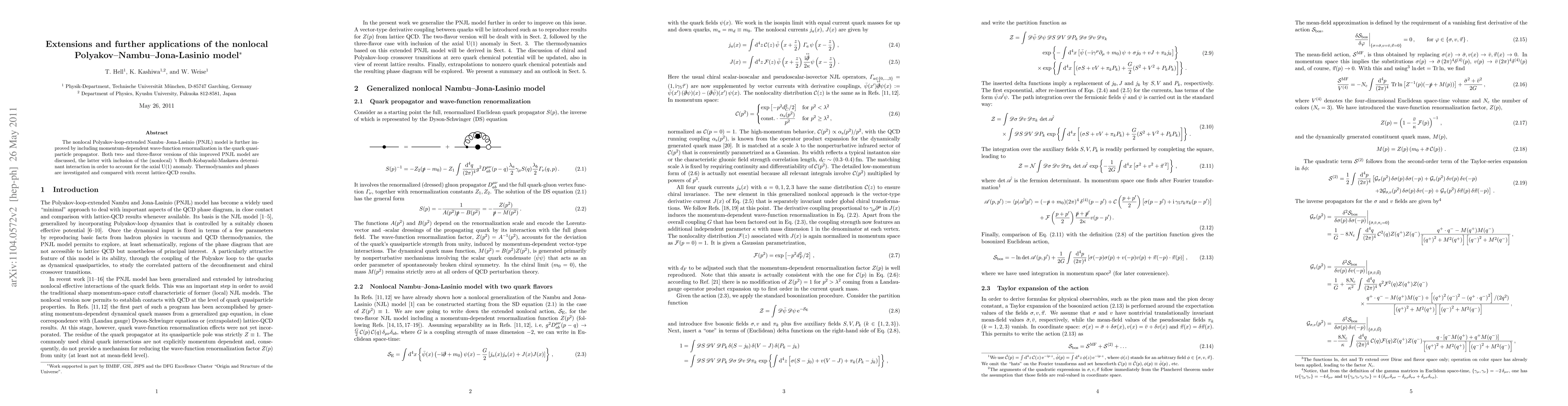The nonlocal Polyakov-loop-extended Nambu--Jona-Lasinio (PNJL) model is further improved by including momentum-dependent wave-function renormalization in the quark quasiparticle propagator. Both two- and three-flavor versions of this improved PNJL model are discussed, the latter with inclusion of the (nonlocal) 't Hooft-Kobayashi-Maskawa determinant interaction in order to account for the axial U(1) anomaly. Thermodynamics and phases are investigated and compared with recent lattice-QCD results.