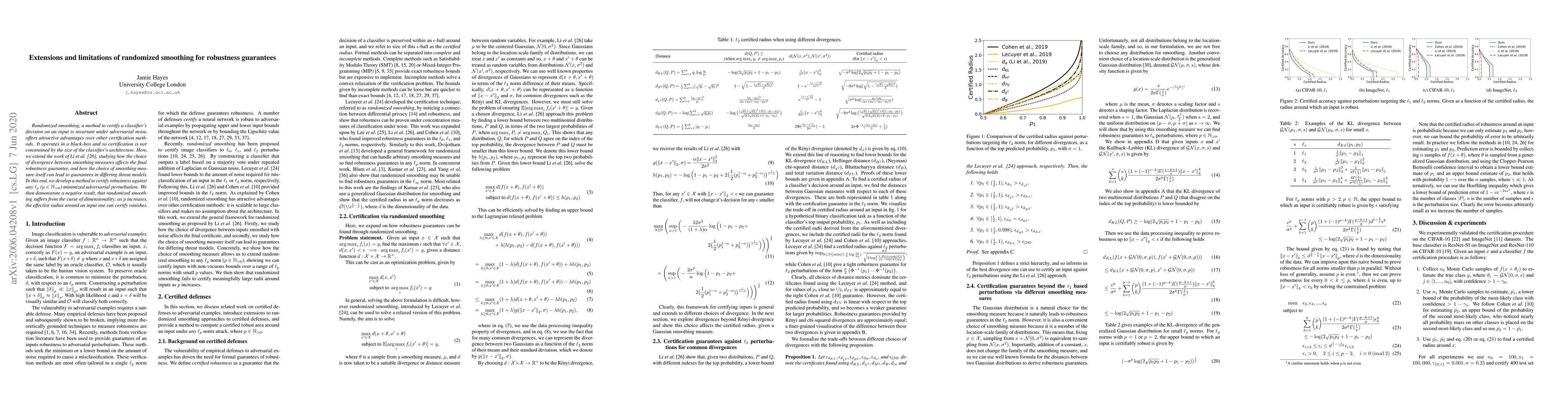 Randomized smoothing, a method to certify a classifier's decision on an input is invariant under adversarial noise, offers attractive advantages over other certification methods. It operates in a black-box and so certification is not constrained by the size of the classifier's architecture. Here, we extend the work of Li et al. \cite{li2018second}, studying how the choice of divergence between smoothing measures affects the final robustness guarantee, and how the choice of smoothing measure itself can lead to guarantees in differing threat models. To this end, we develop a method to certify robustness against any $\ell_p$ ($p\in\mathbb{N}_{>0}$) minimized adversarial perturbation. We then demonstrate a negative result, that randomized smoothing suffers from the curse of dimensionality; as $p$ increases, the effective radius around an input one can certify vanishes.