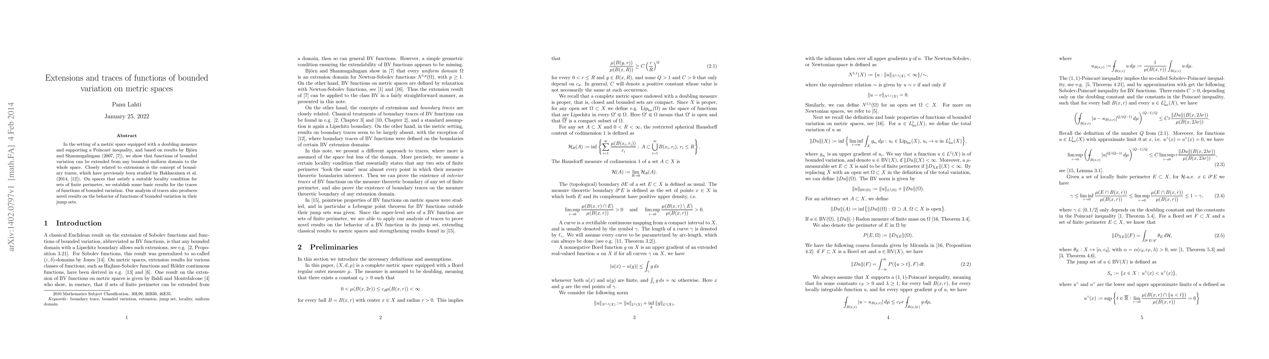 This paper extends functions of bounded variation from bounded uniform domains to the entire metric space under certain conditions, leveraging results from Björ and Shanmugalingam. The study also investigates boundary traces of these functions and provides new insights into their behavior in jump sets.