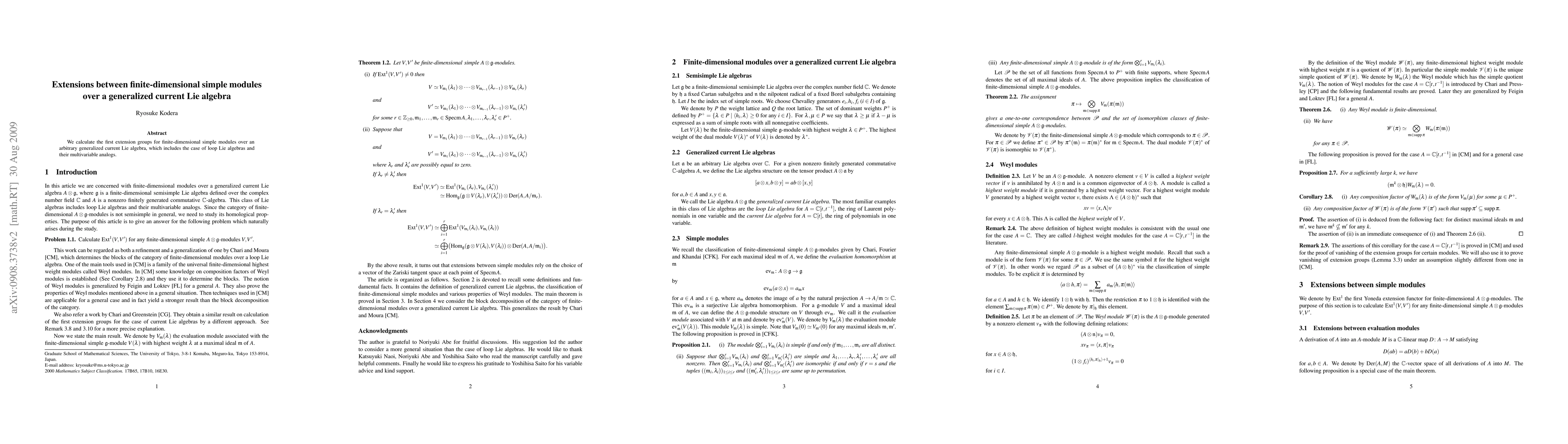 Title: Extensions between finite-dimensional simple modules over a generalized current Lie algebra Summary: This paper computes the first extension groups for finite-dimensional simple modules over generalized current Lie algebras, encompassing loop Lie algebras and their multivariable analogs.