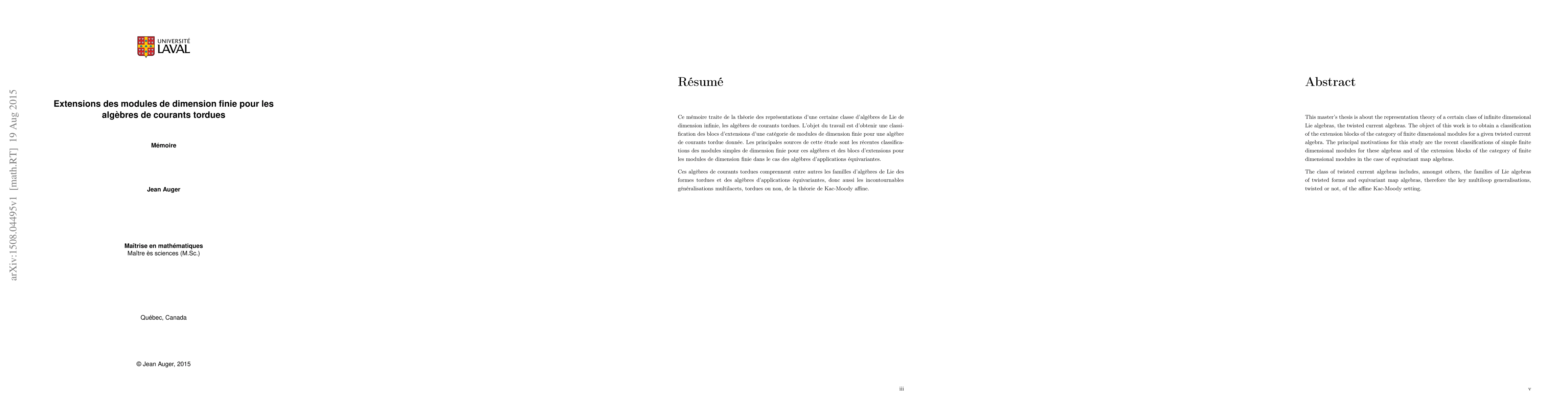 Ce m\'emoire traite de la th\'eorie des repr\'esentations d'une certaine classe d'alg\`ebres de Lie de dimension infinie, les alg\`ebres de courants tordues. L'objet du travail est d'obtenir une classification des blocs d'extensions d'une cat\'egorie de modules de dimension finie pour une alg\`ebre de courants tordue donn\'ee. Les principales sources de cette \'etude sont les r\'ecentes classifications des modules simples de dimension finie pour ces alg\`ebres et des blocs d'extensions pour les modules de dimension finie dans le cas des alg\`ebres d'applications \'equivariantes. Ces alg\`ebres de courants tordues comprennent entre autres les familles d'alg\`ebres de Lie des formes tordues et des alg\`ebres d'applications \'equivariantes, donc aussi les incontournables g\'en\'eralisations multilacets, tordues ou non, de la th\'eorie de Kac-Moody affine. / / / / / This master's thesis is about the representation theory of a certain class of infinite dimensional Lie algebras, the twisted current algebras. The object of this work is to obtain a classification of the extension blocks of the category of finite dimensional modules for a given twisted current algebra. The principal motivations for this study are the recent classifications of simple finite dimensional modules for these algebras and of the extension blocks of the category of finite dimensional modules in the case of equivariant map algebras. The class of twisted current algebras includes, amongst others, the families of Lie algebras of twisted forms and equivariant map algebras, therefore the key multiloop generalisations, twisted or not, of the affine Kac-Moody setting.