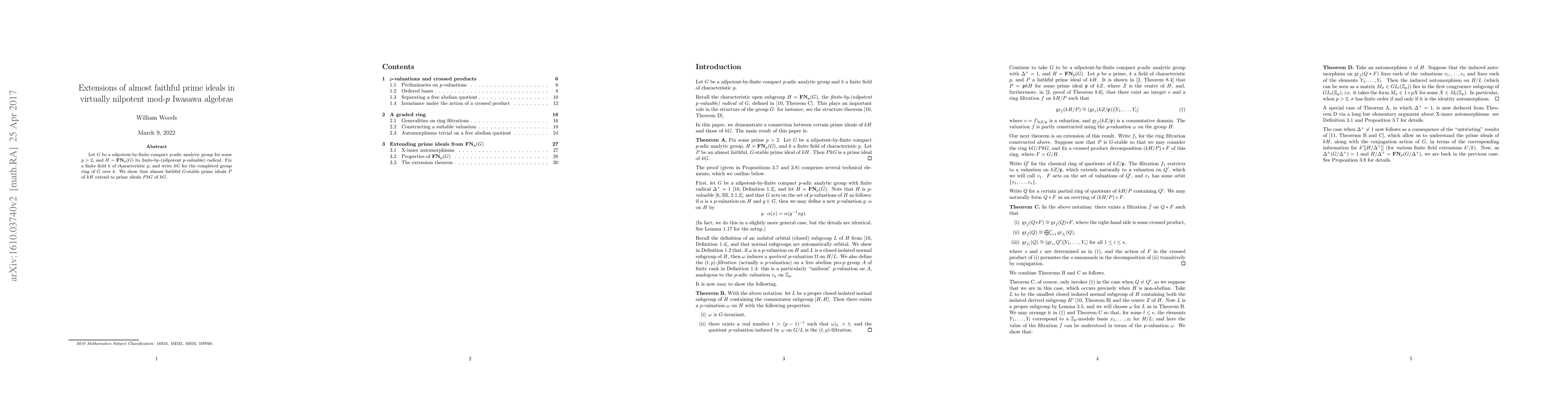 This paper demonstrates that almost faithful $G$-stable prime ideals in the completed group ring $kH$ of a nilpotent-by-finite $p$-adic analytic group $G$ extend to prime ideals in the larger completed group ring $kG$. The focus is on virtually nilpotent mod-$p$ Iwasawa algebras.